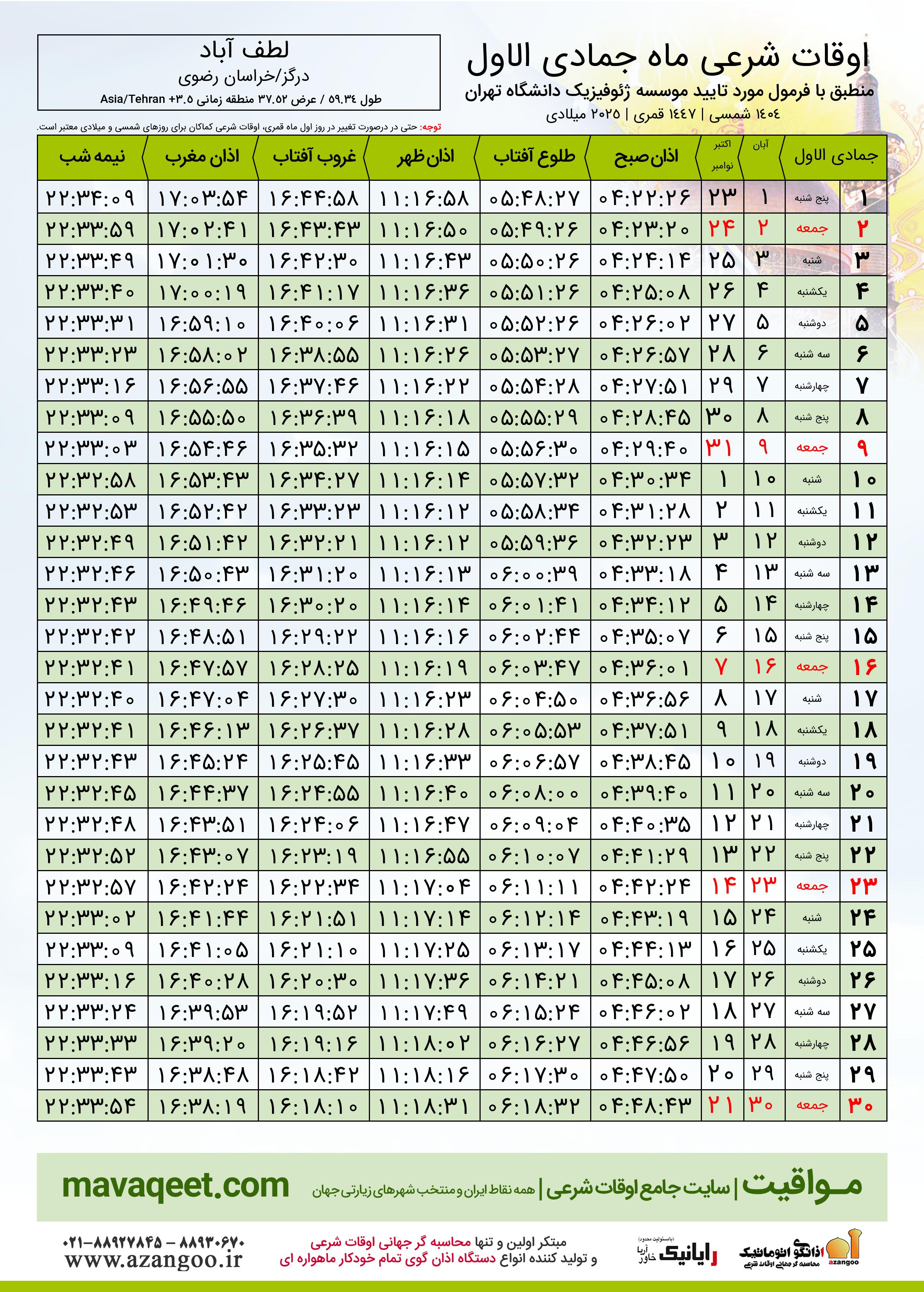اوقات شرعی ماه جمادی الاول ١٤٤٧ هـ.ق شهر لطف آباد بر