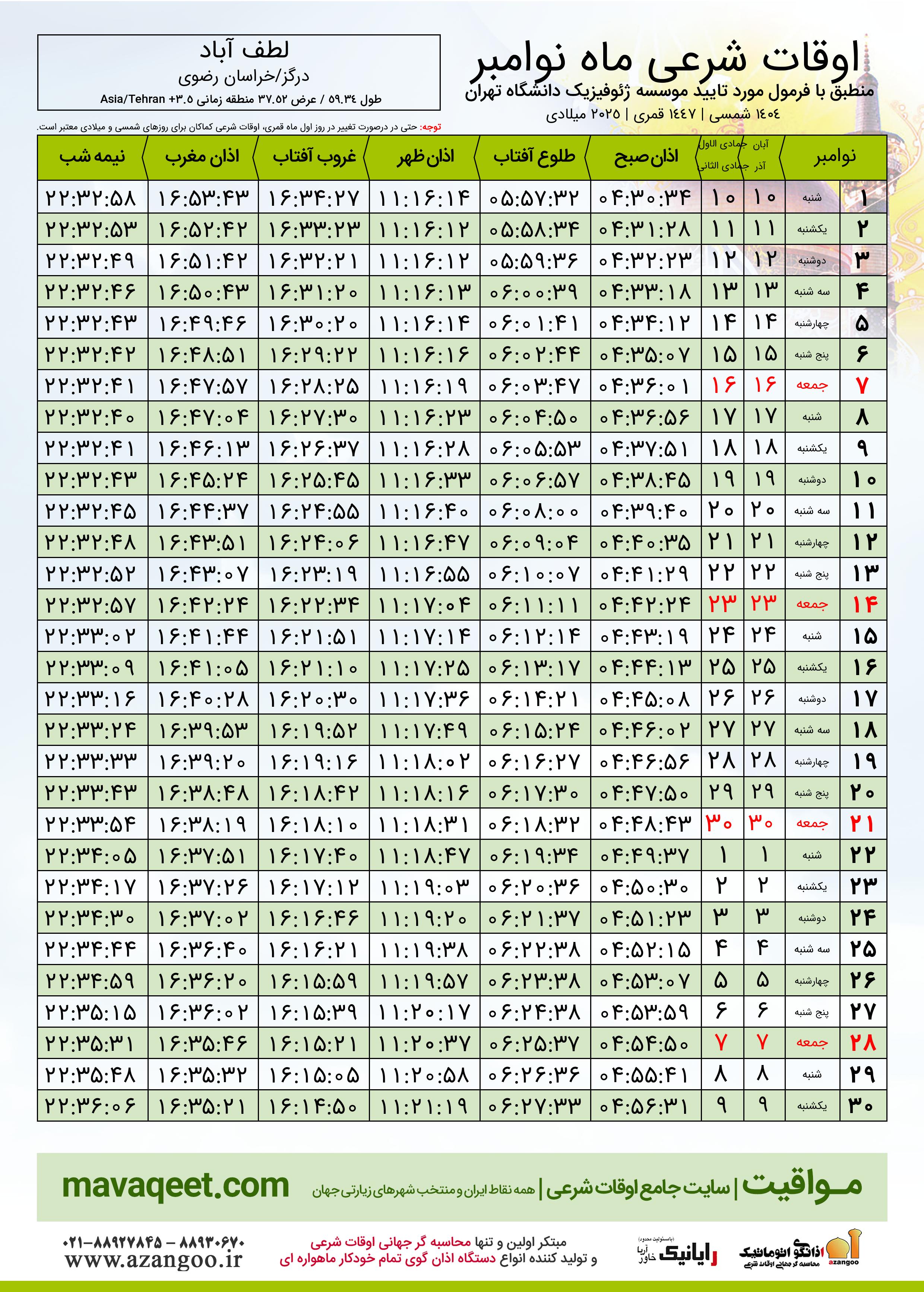 جدول اوقات شرعی نوامبر ٢٠٢٥ میلادی شهر لطف آباد