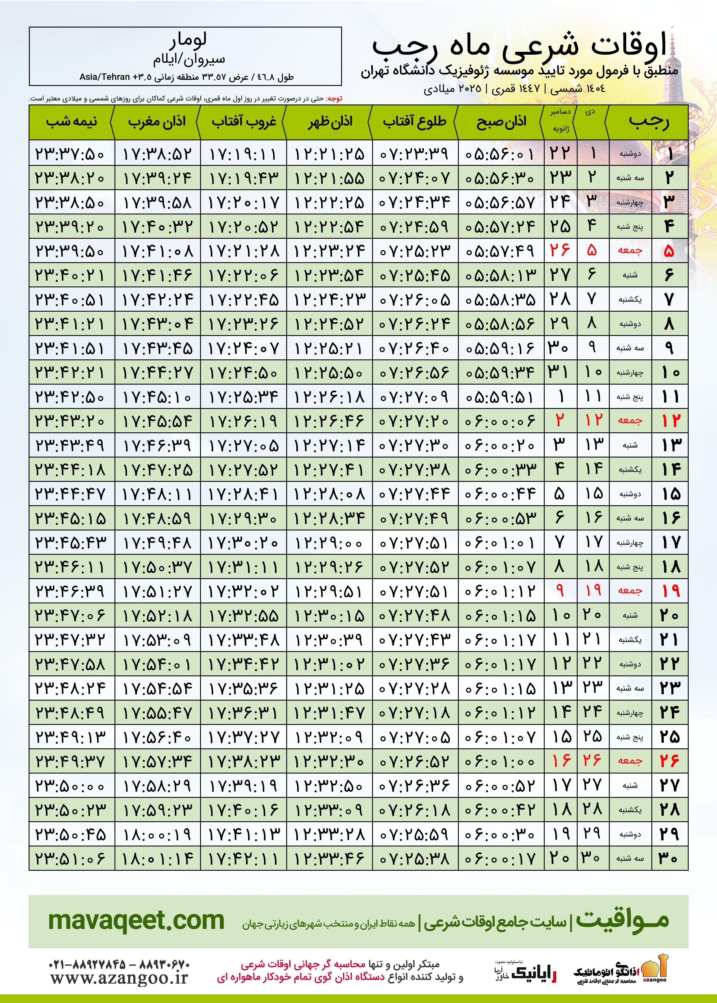 اوقات شرعی ماه رجب ١٤٤٧ هـ.ق شهر لومار بر