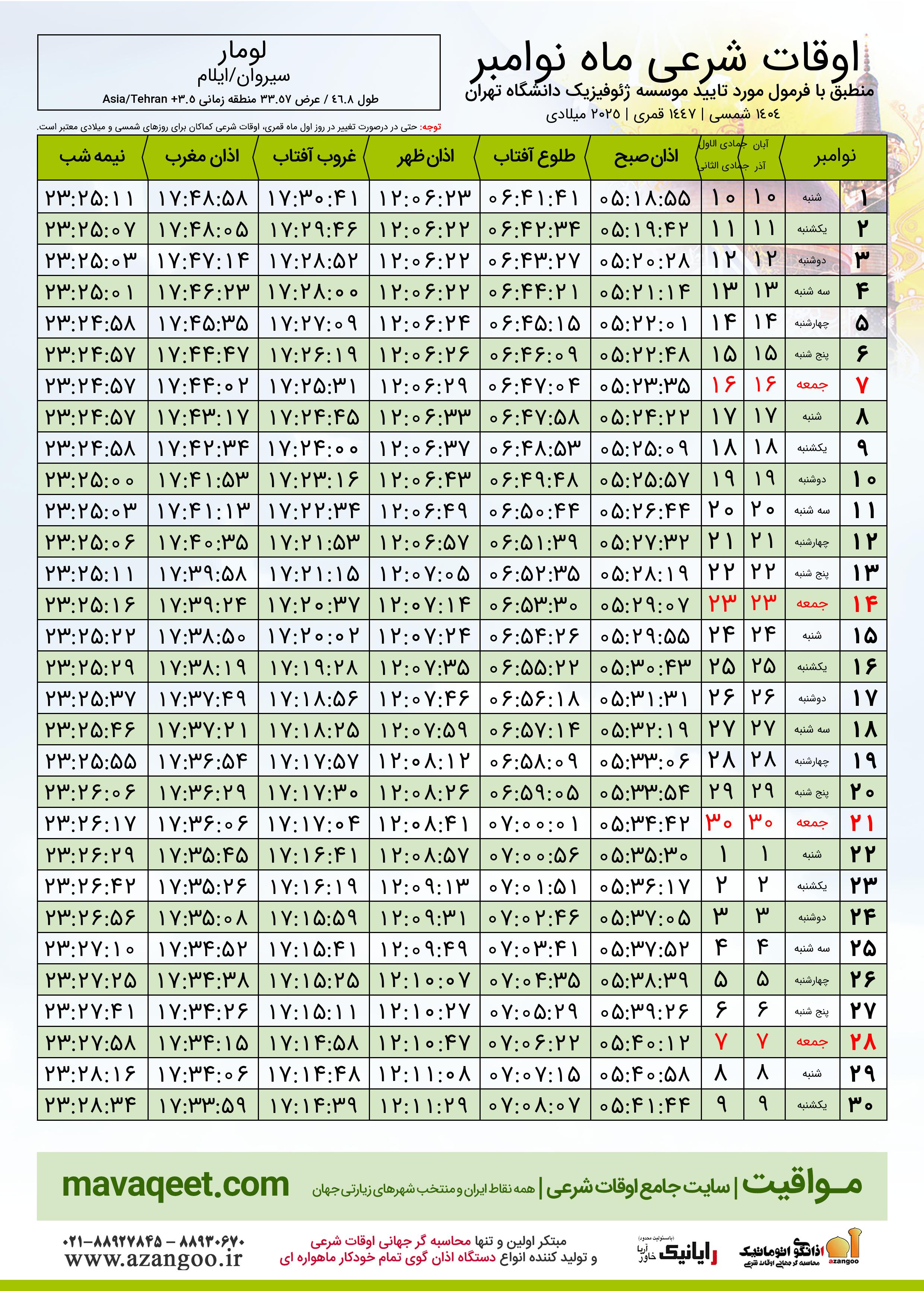 جدول اوقات شرعی آبان ١٤٠٤ شمسی شهر لومار