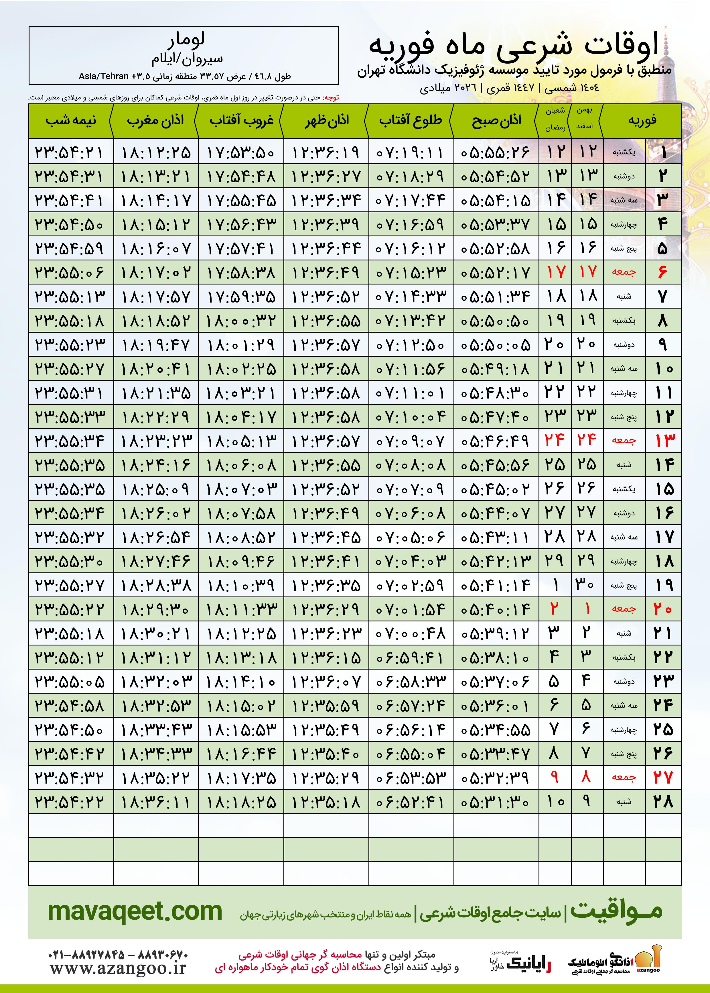دانلود اوقات شرعی ماه رمضان ٠٤ - ١٤٠٤ شمسی | ٢٠٢٦ میلادی | ١٤٤٧ قمری شهر لومار