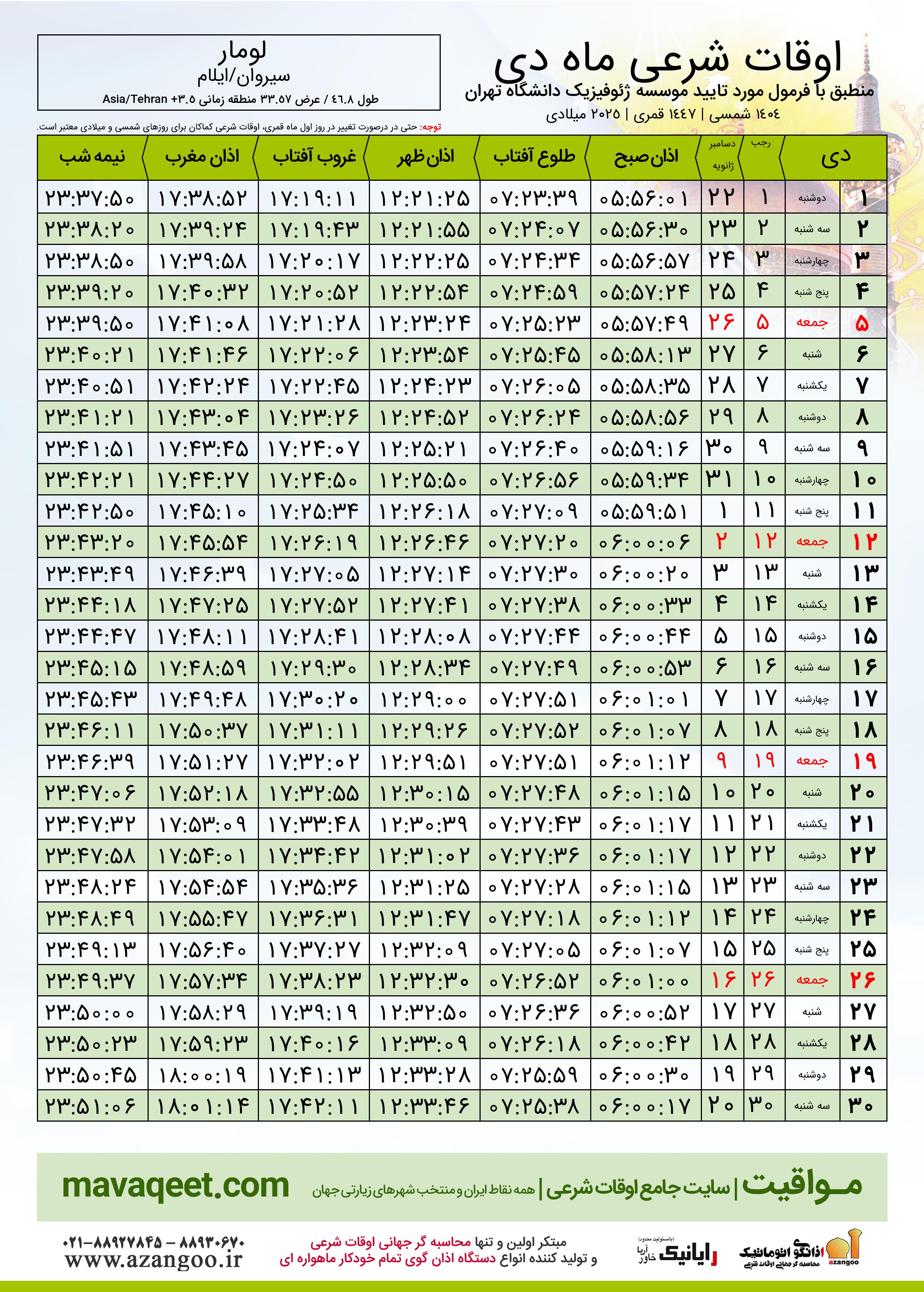 اوقات شرعی دی ١٤٠٤ شمسی شهر لومار