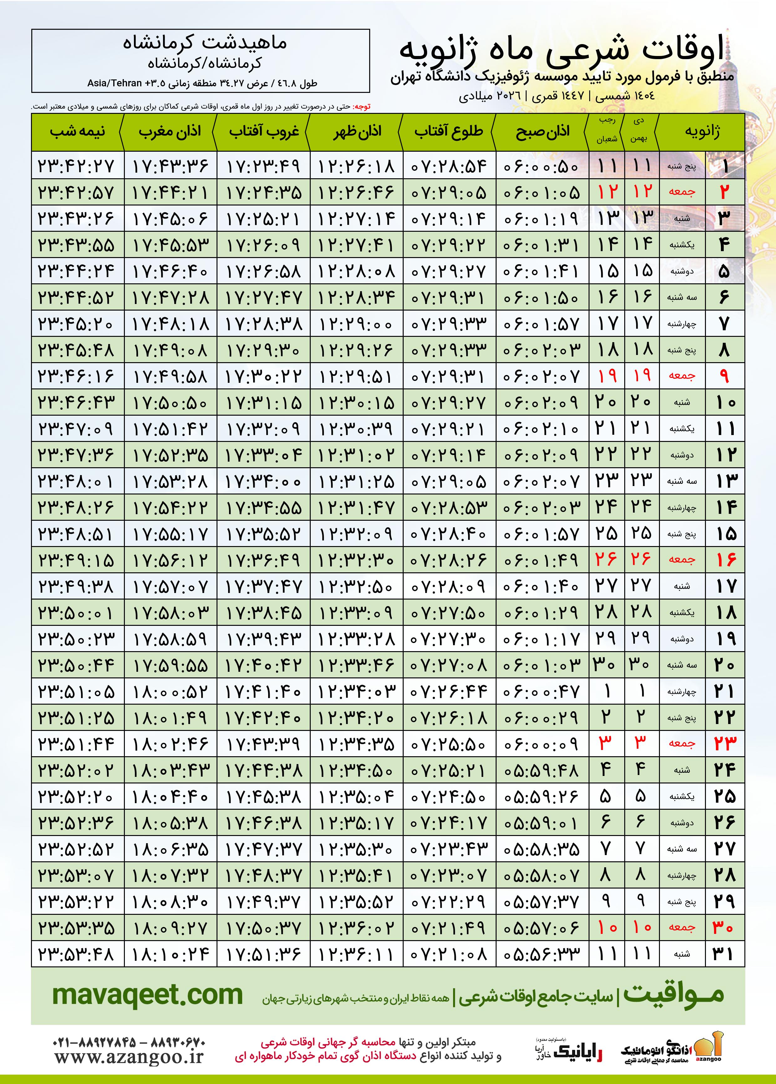 اوقات شرعی ژانویه ٢٠٢٦ میلادی شهر ماهیدشت کرمانشاه