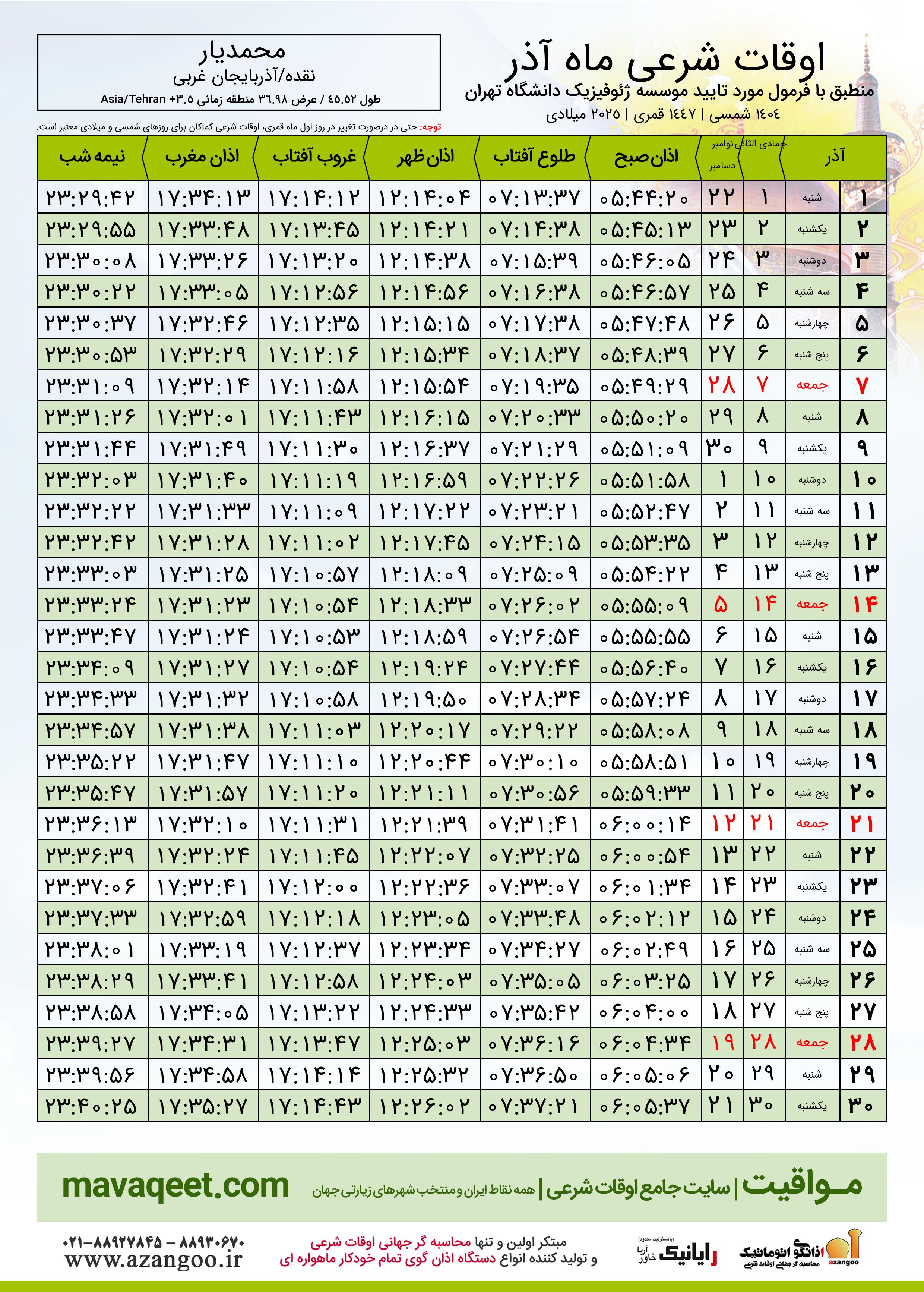 اوقات شرعی آذر ١٤٠٤ شمسی شهر محمدیار