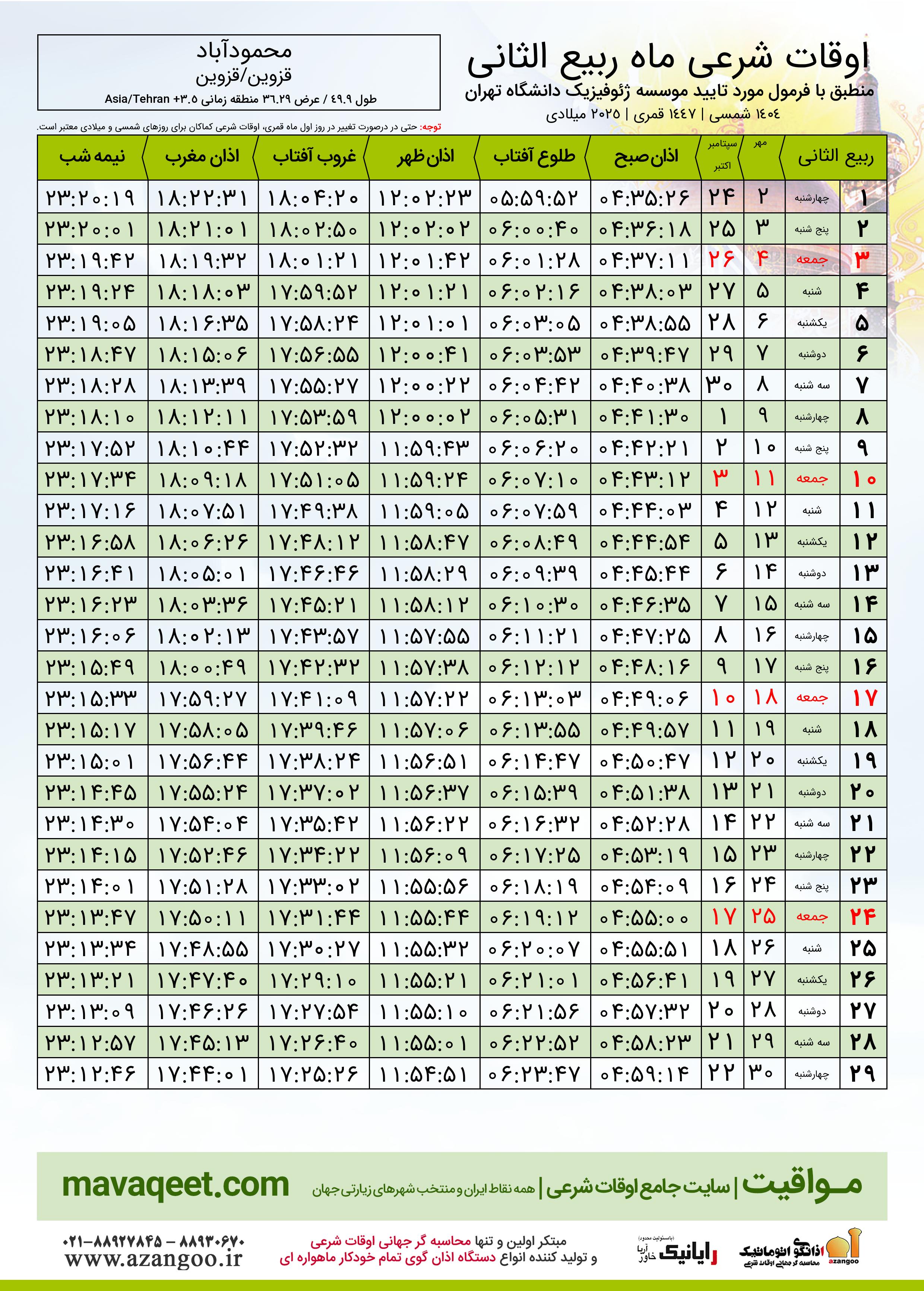 جدول اوقات شرعی ربیع الثانی ١٤٤٧ قمری شهر محمودآباد