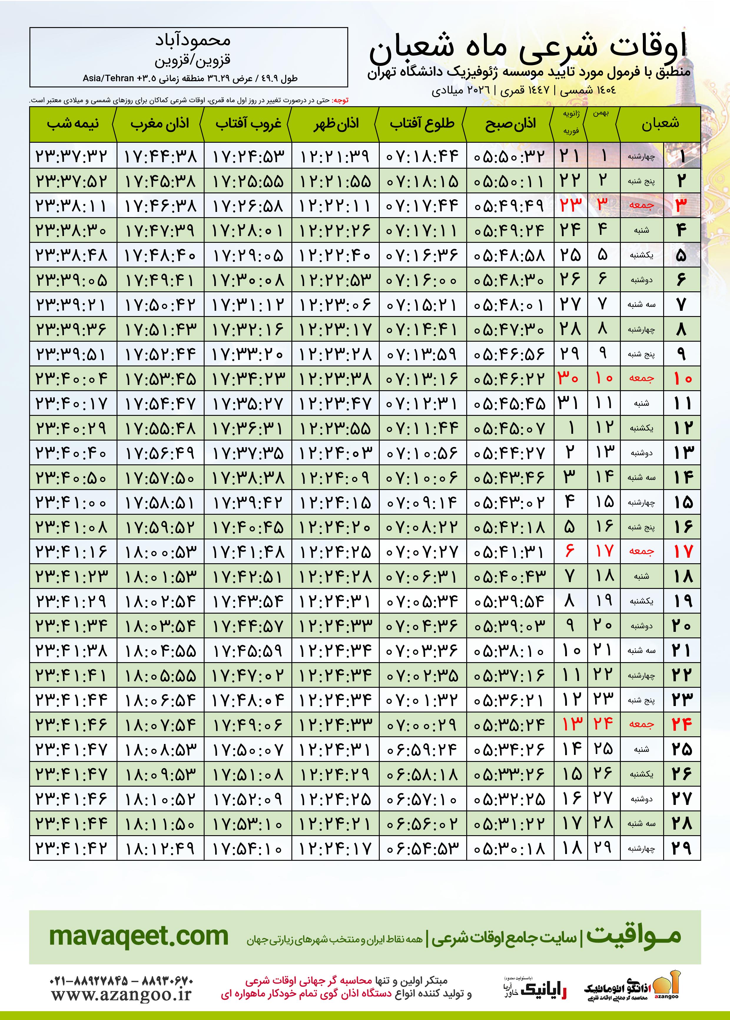 اوقات شرعی شعبان ١٤٤٧ شهر محمودآباد + دانلود