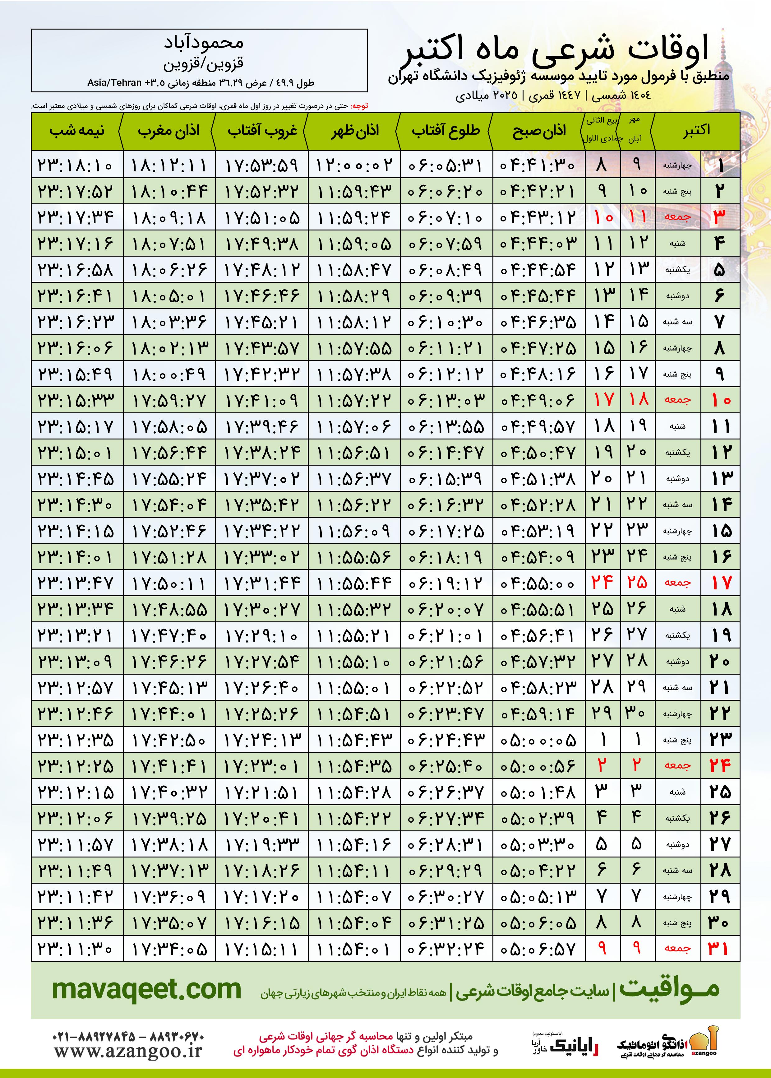 اوقات شرعی اکتبر ٢٠٢٥ میلادی شهر محمودآباد