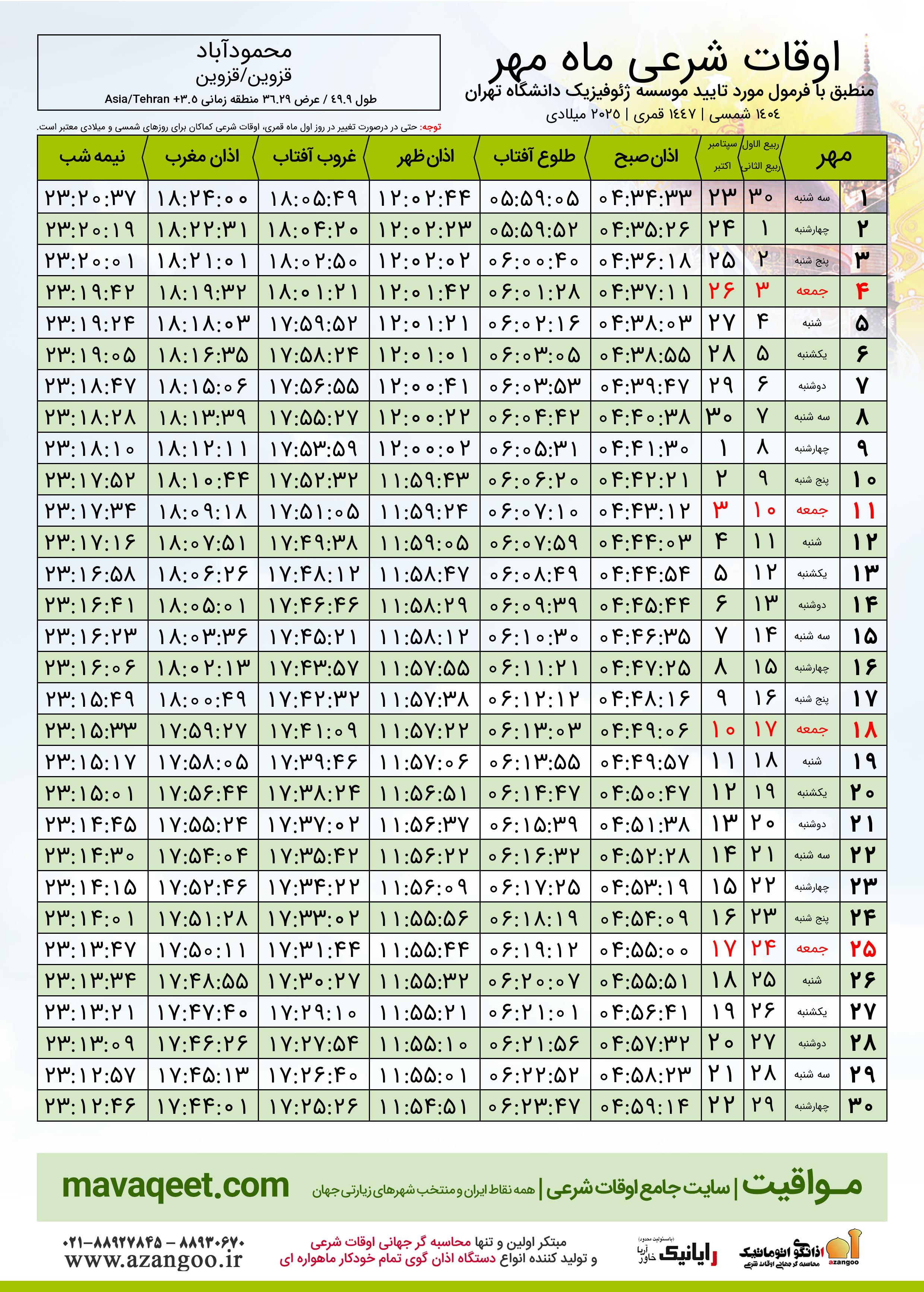 اوقات شرعی مهر ١٤٠٤ شمسی شهر محمودآباد