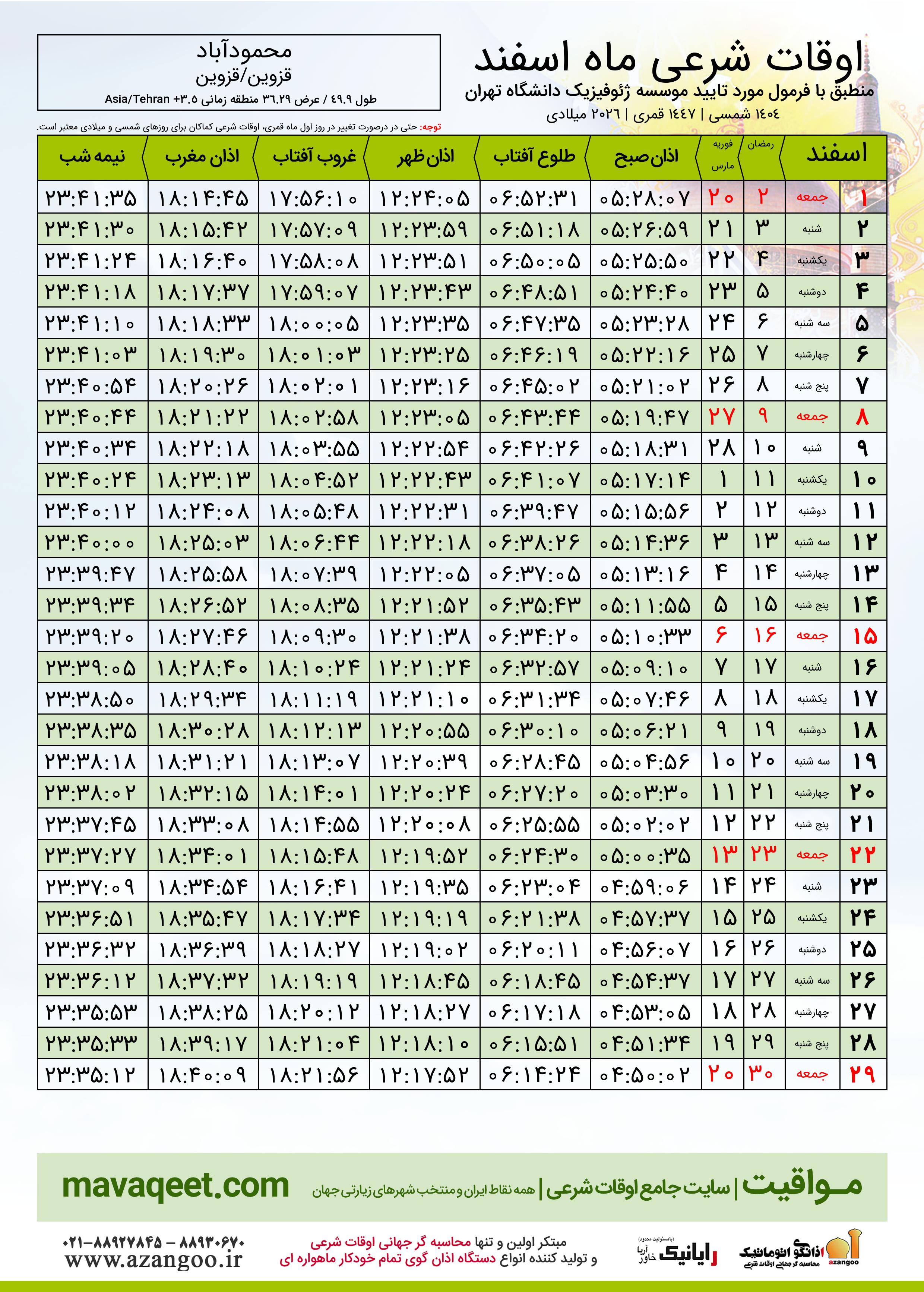 اوقات شرعی اسفند ١٤٠٤ شمسی شهر محمودآباد