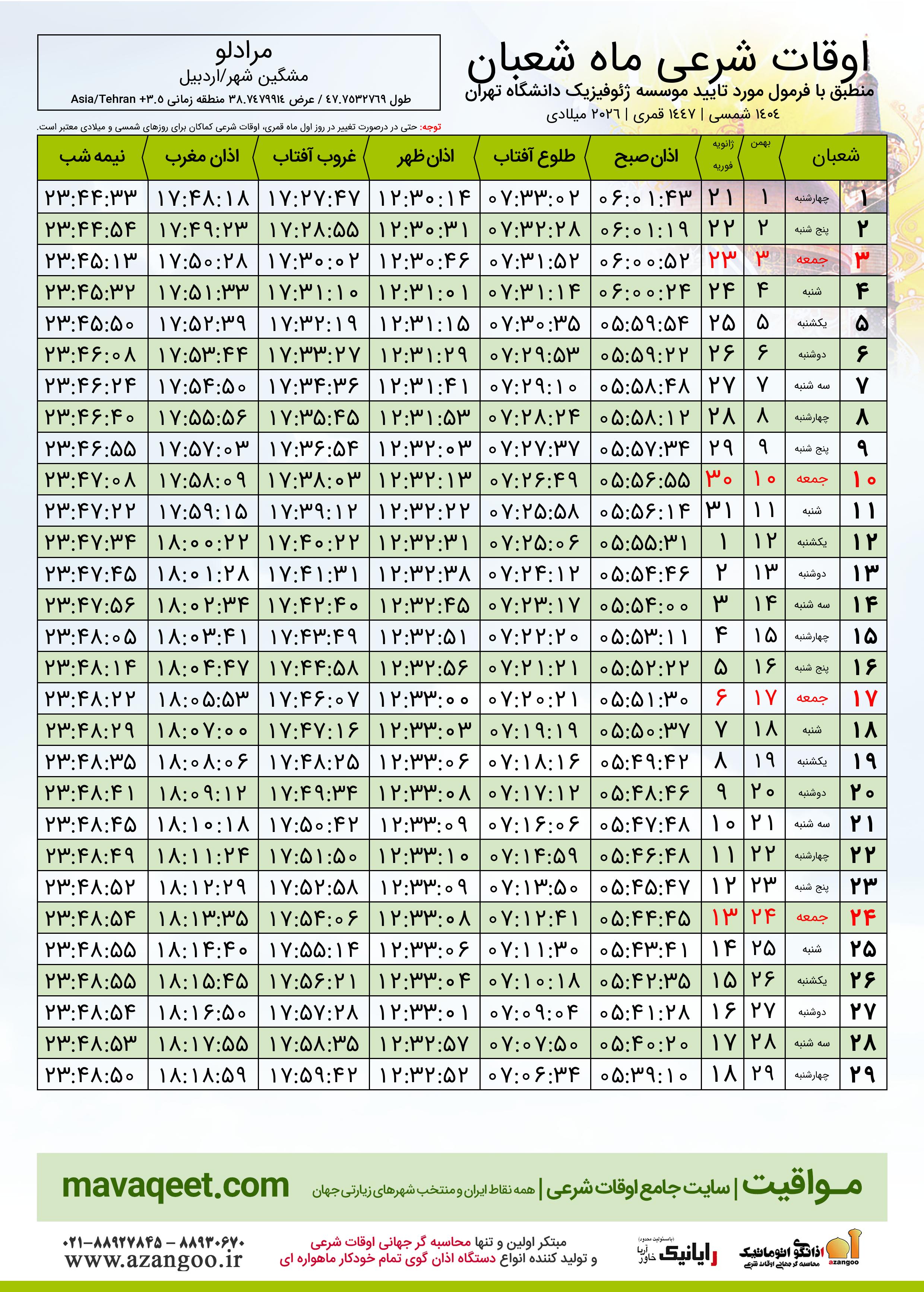 اوقات شرعی ماه شعبان ١٤٤٧ هـ.ق شهر مرادلو بر