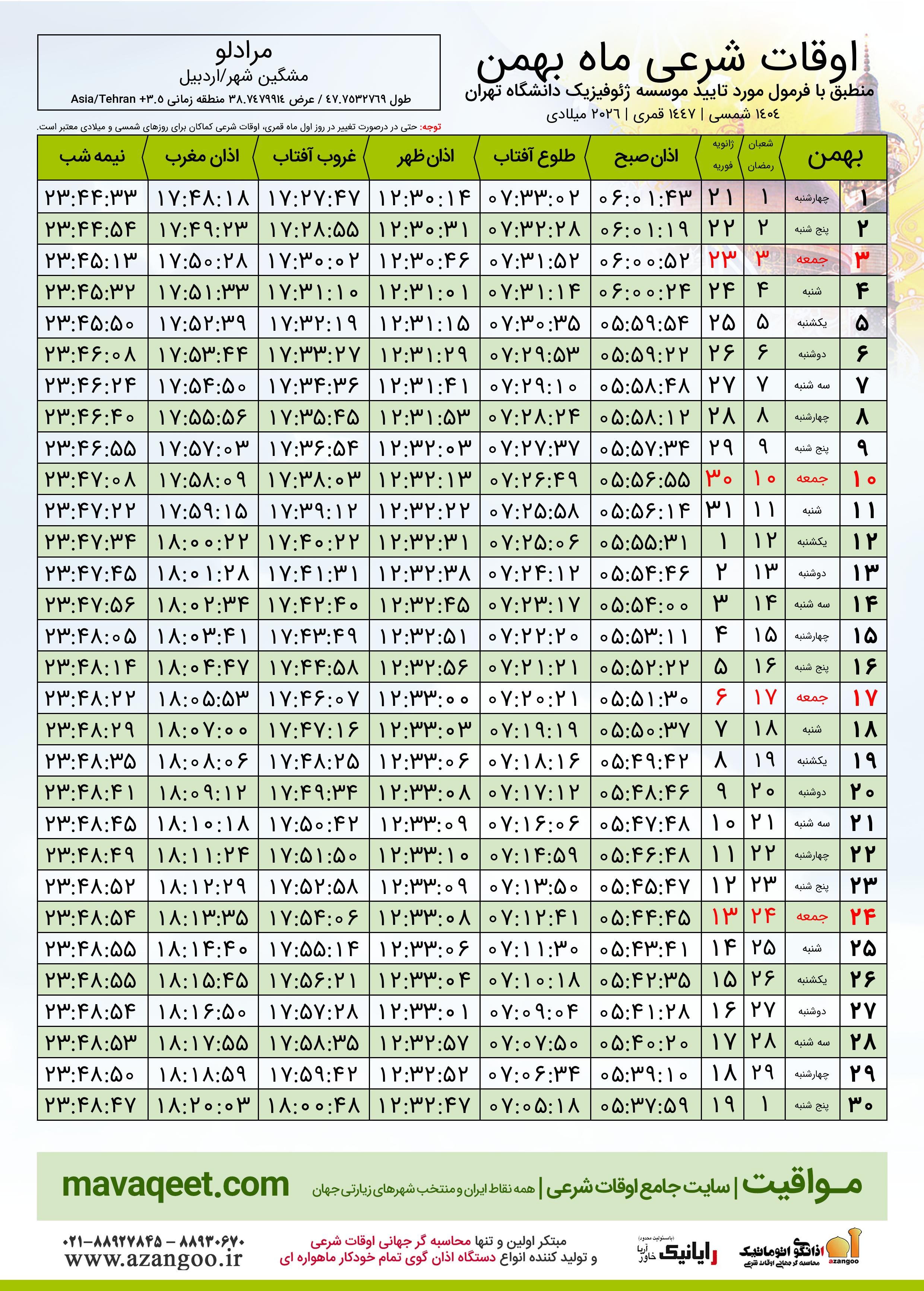دانلود اوقات شرعی بهمن ٠٤ - ١٤٠٤ شهر مرادلو