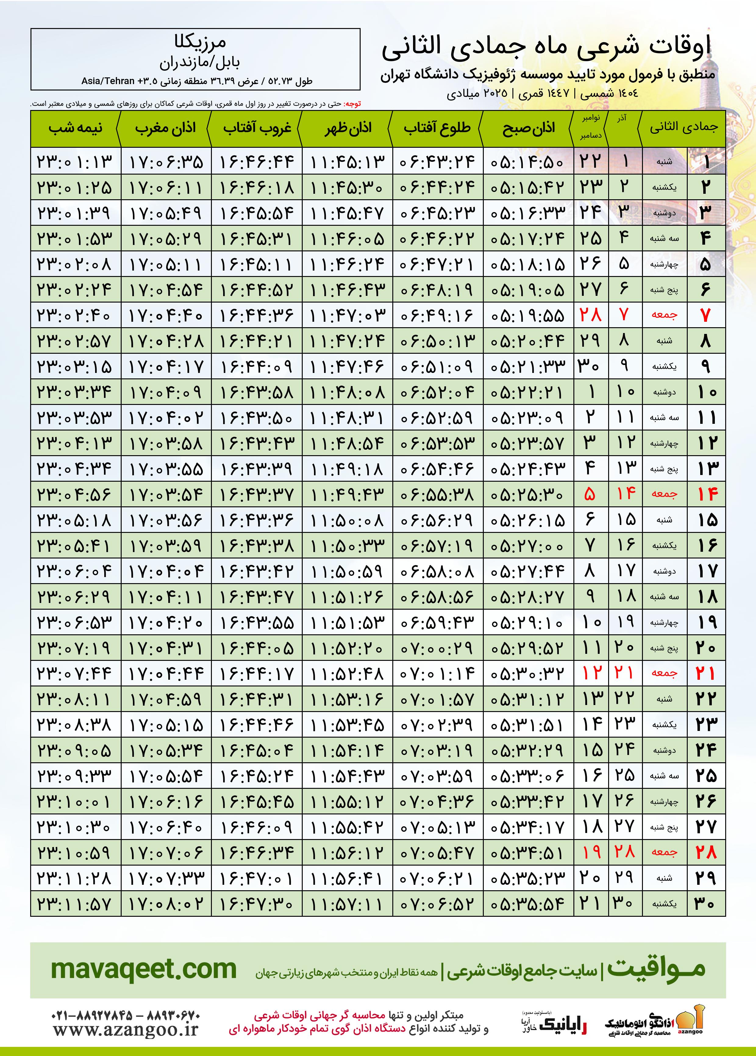 اوقات شرعی ماه جمادی الثانی ١٤٤٧ هـ.ق شهر مرزیکلا بر