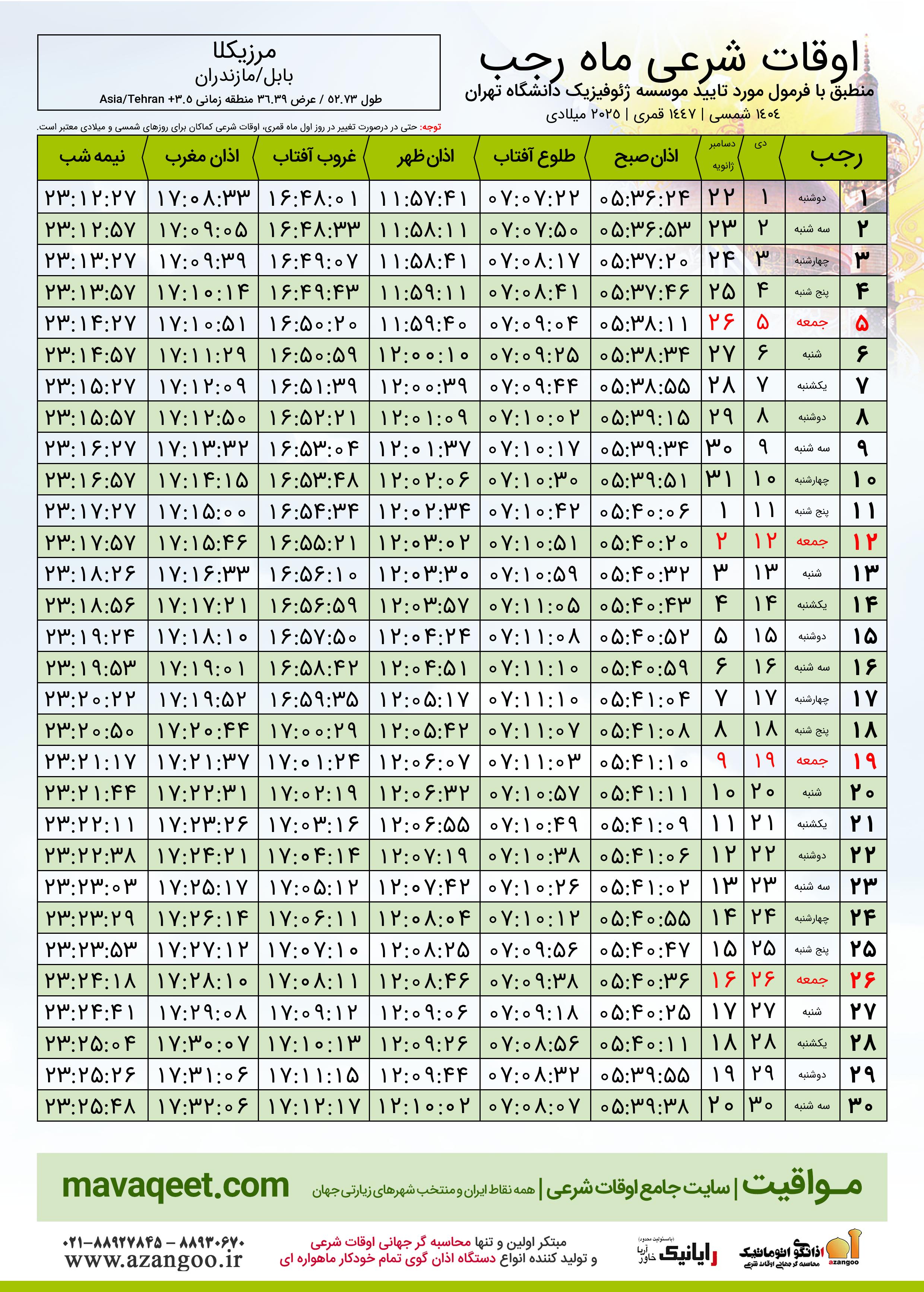 اوقات شرعی ماه رجب ١٤٤٧ هـ.ق شهر مرزیکلا بر