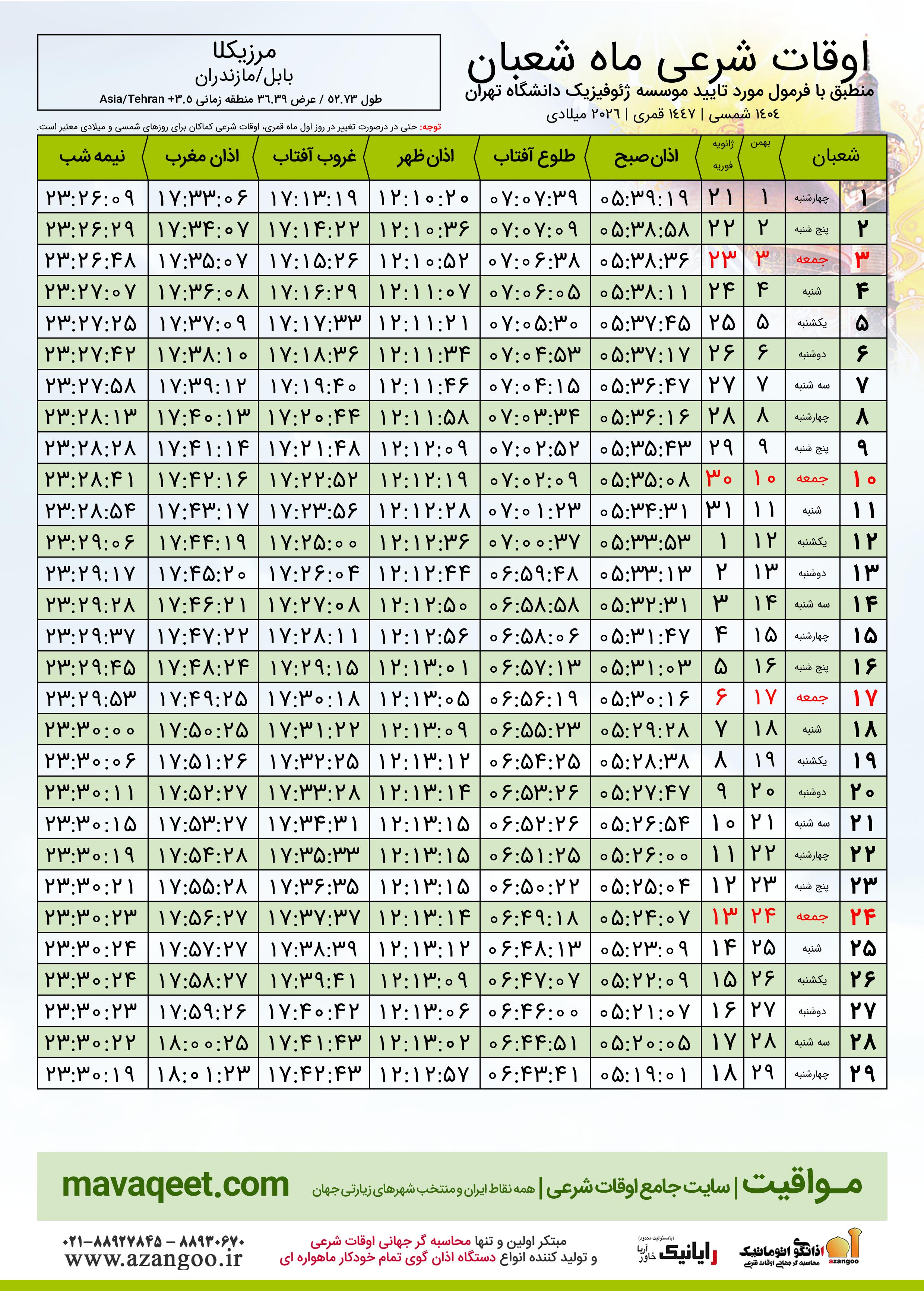 اوقات شرعی ماه شعبان ١٤٤٧ هـ.ق شهر مرزیکلا بر