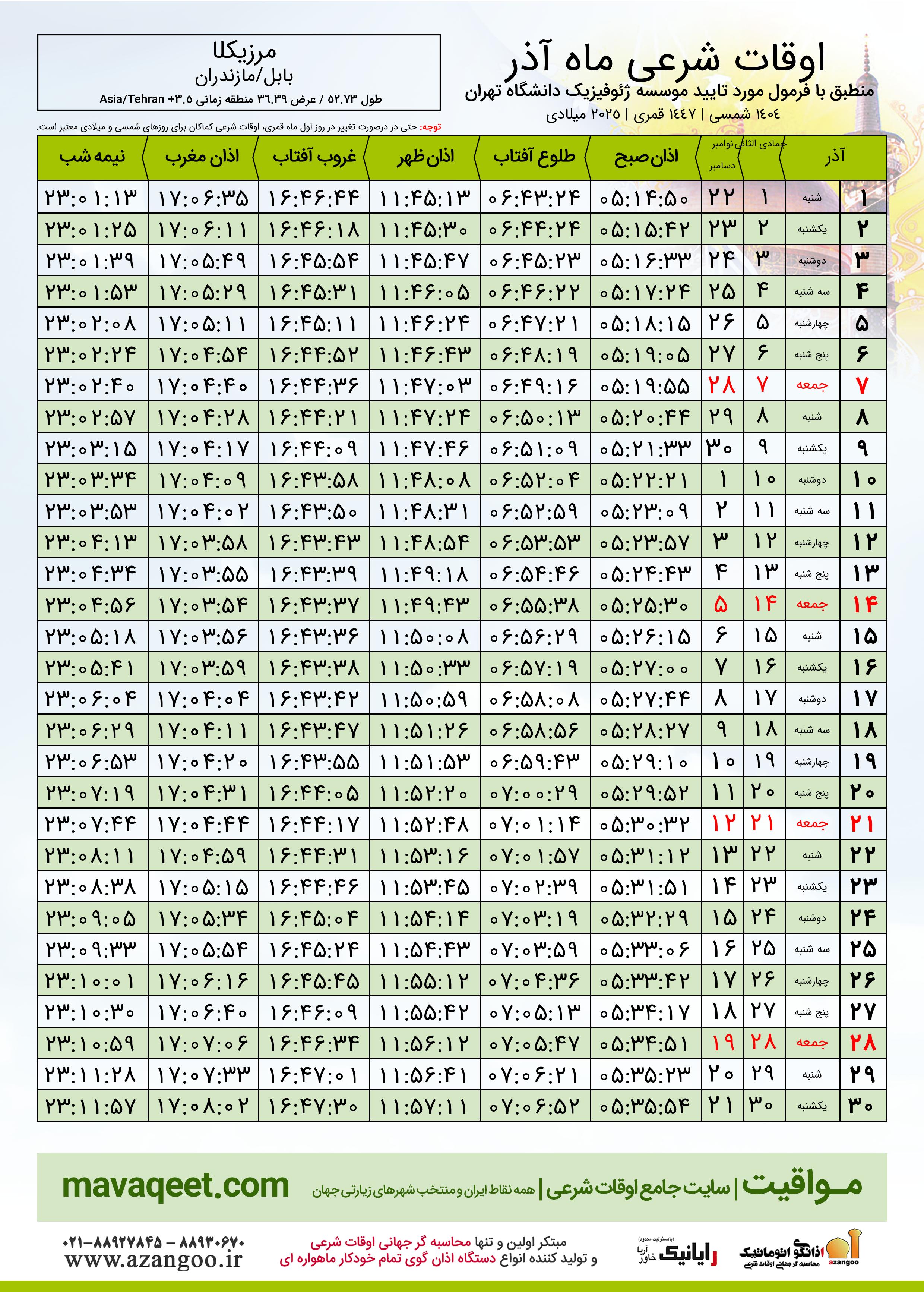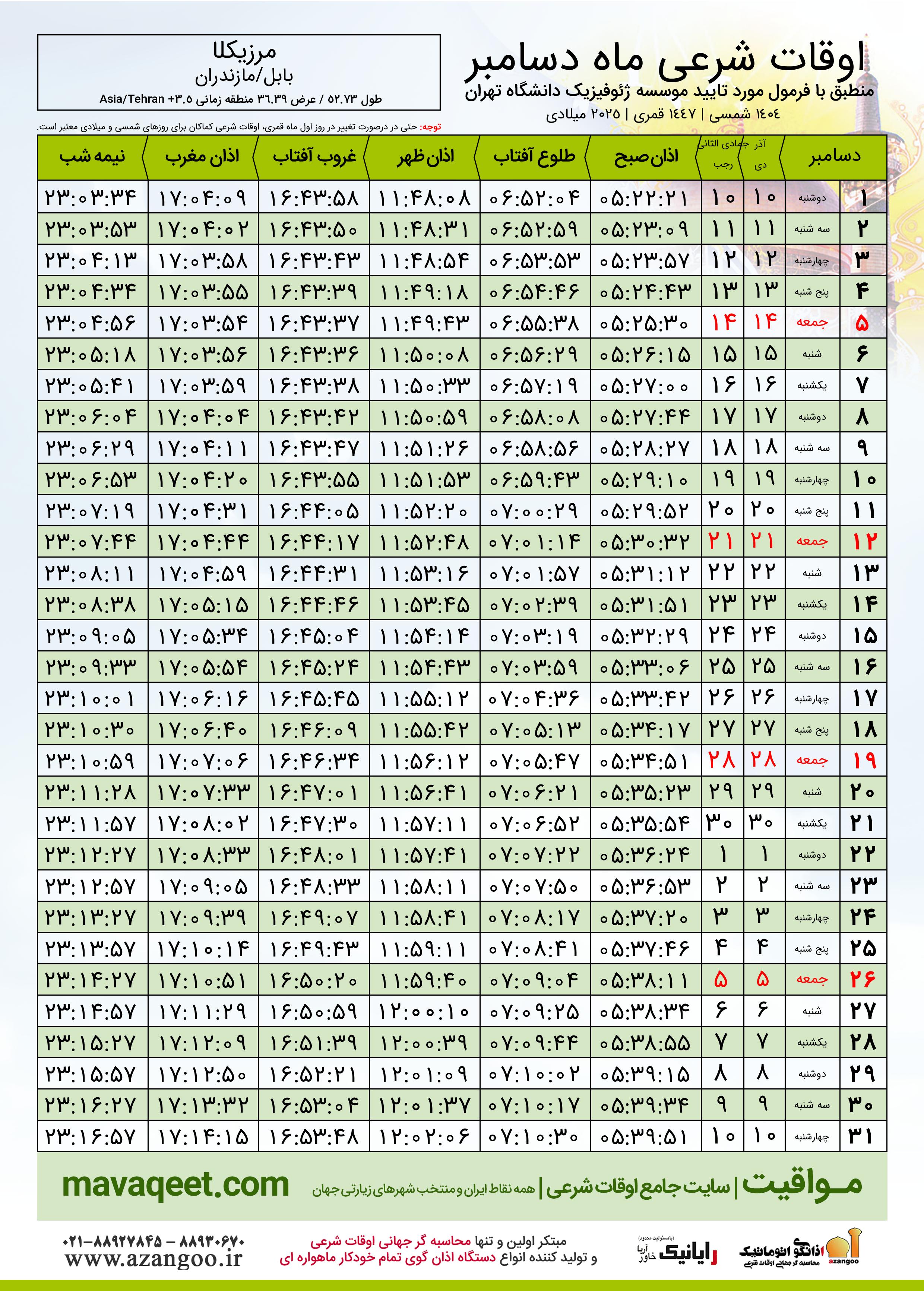 جدول اوقات شرعی آذر ١٤٠٤ شمسی شهر مرزیکلا