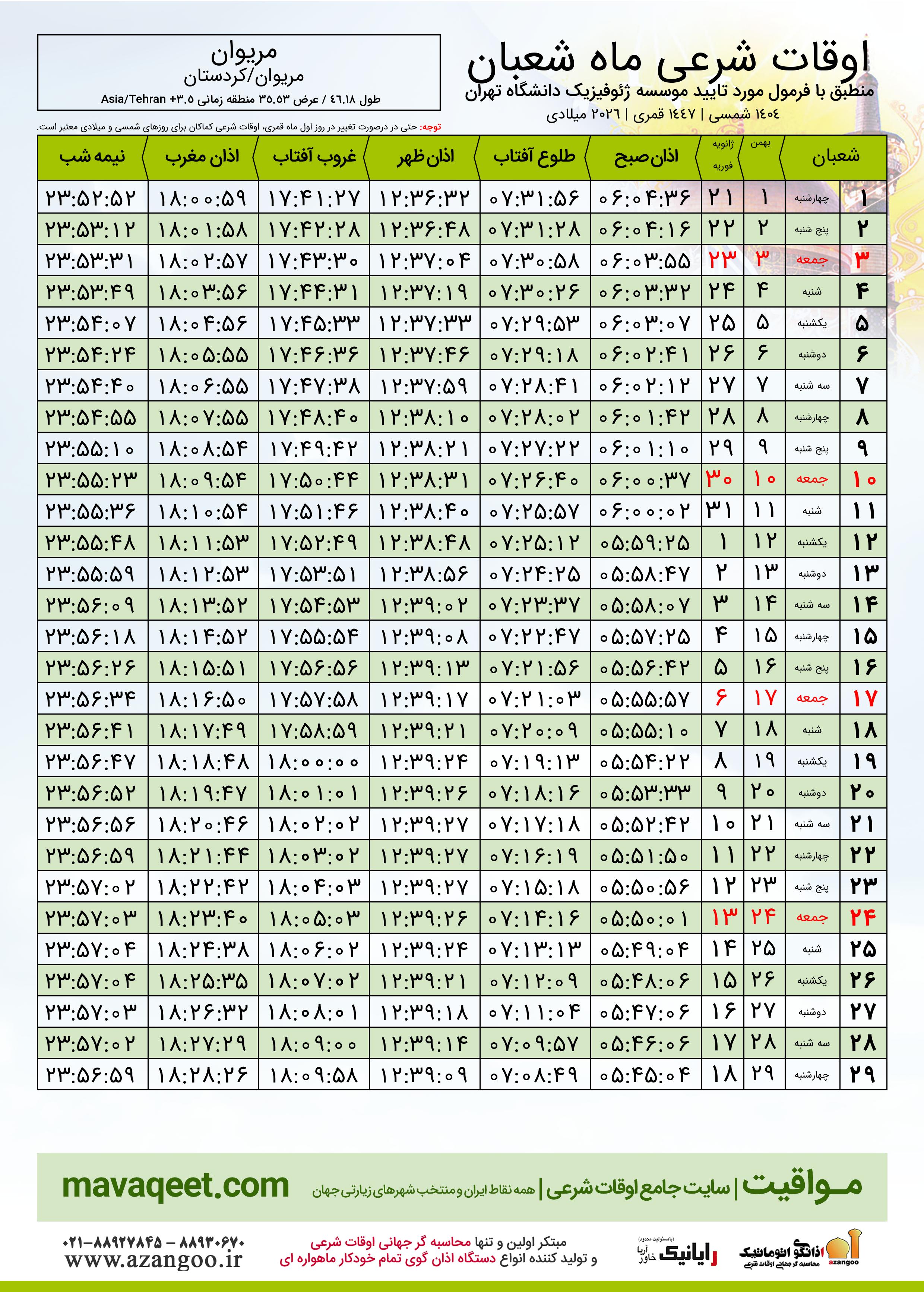 اوقات شرعی ماه شعبان ١٤٤٧ هـ.ق شهر مریوان بر