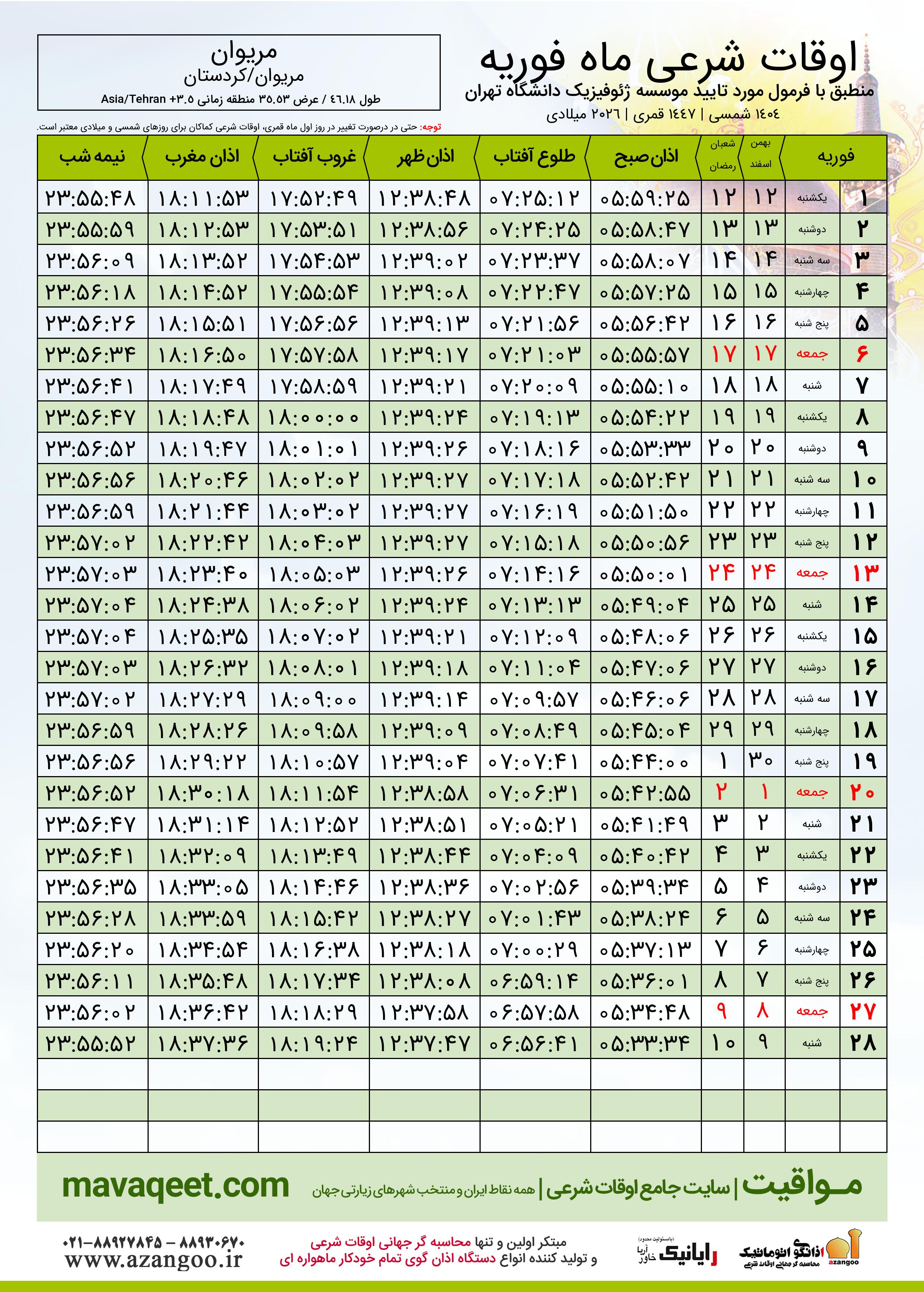 اوقات شرعی ماه رمضان شهر مریوان ١٤٠٤ - ٠٤ شمسی | ٢٠٢٦ میلادی