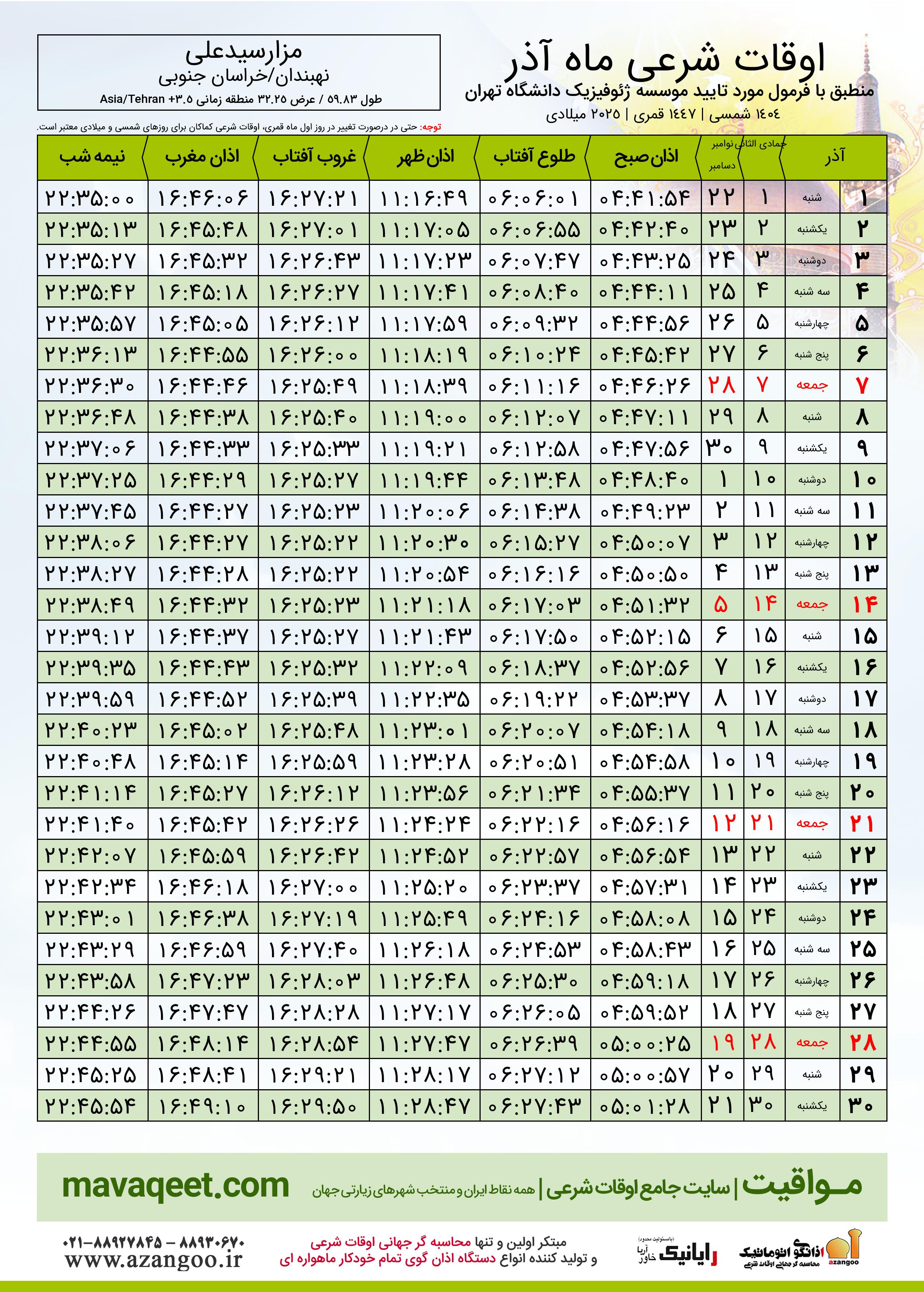 اوقات شرعی آذر ١٤٠٤ شمسی شهر مزارسیدعلی