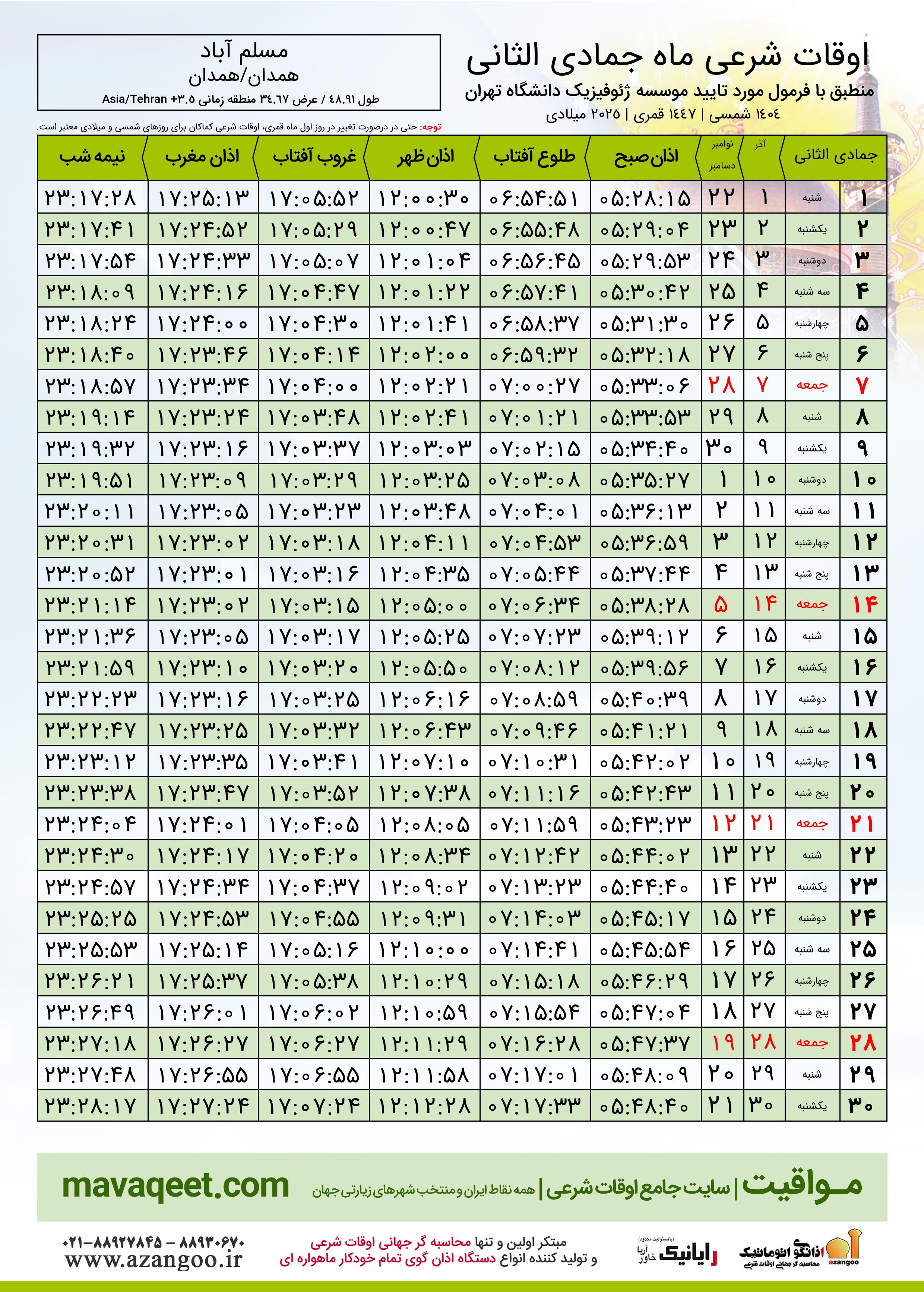 اوقات شرعی ماه جمادی الثانی ١٤٤٧ هـ.ق شهر مسلم آباد بر