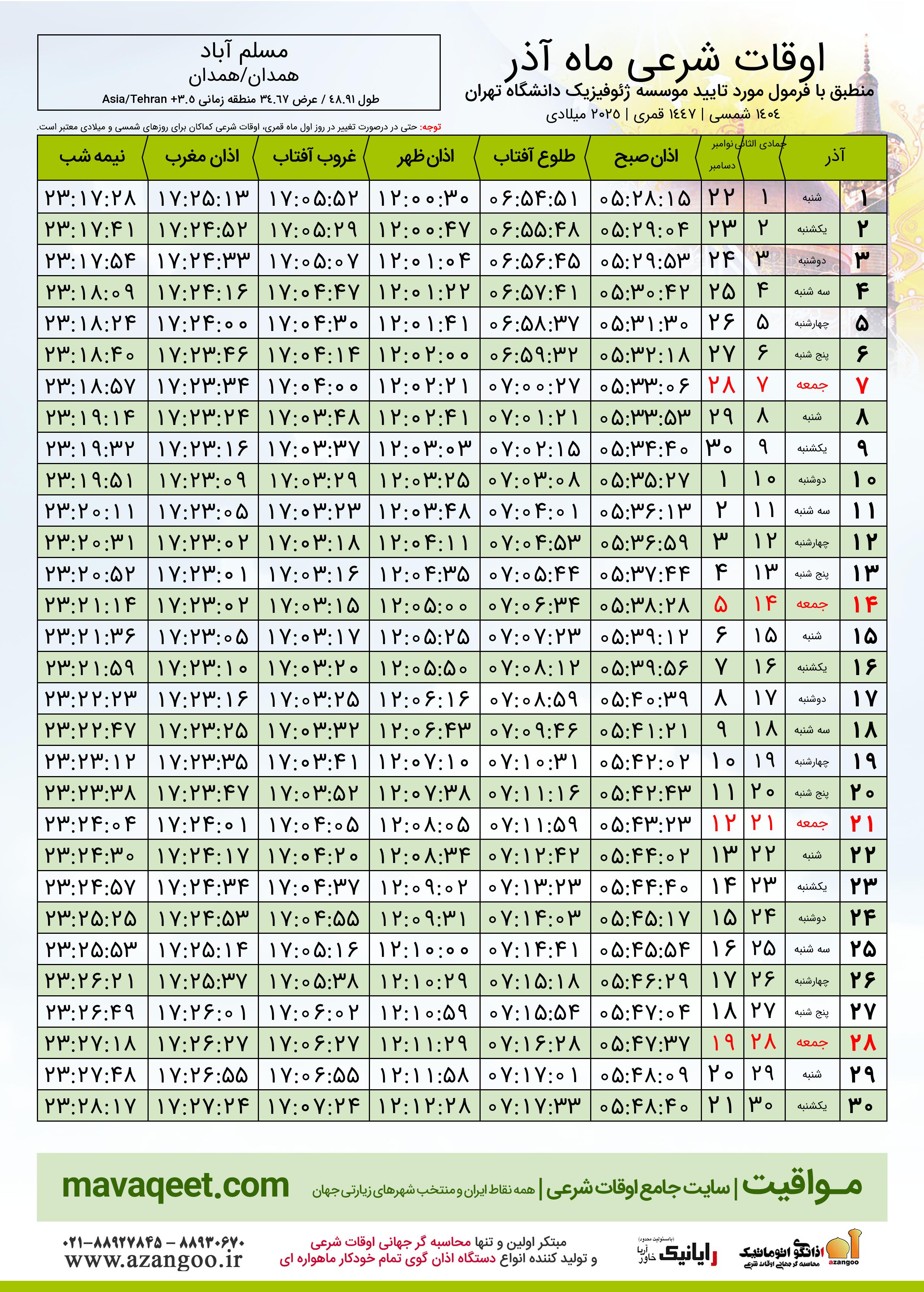 اوقات شرعی آذر ١٤٠٤ شمسی شهر مسلم آباد