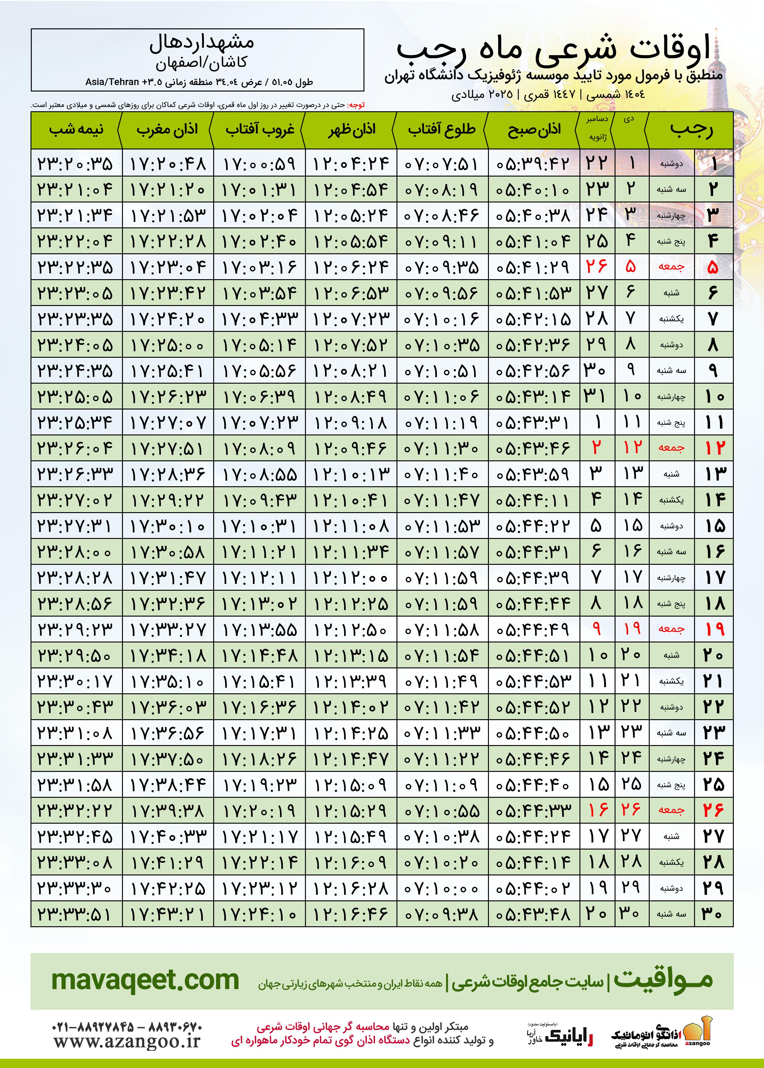 اوقات شرعی ماه رجب ١٤٤٧ هـ.ق شهر مشهداردهال بر