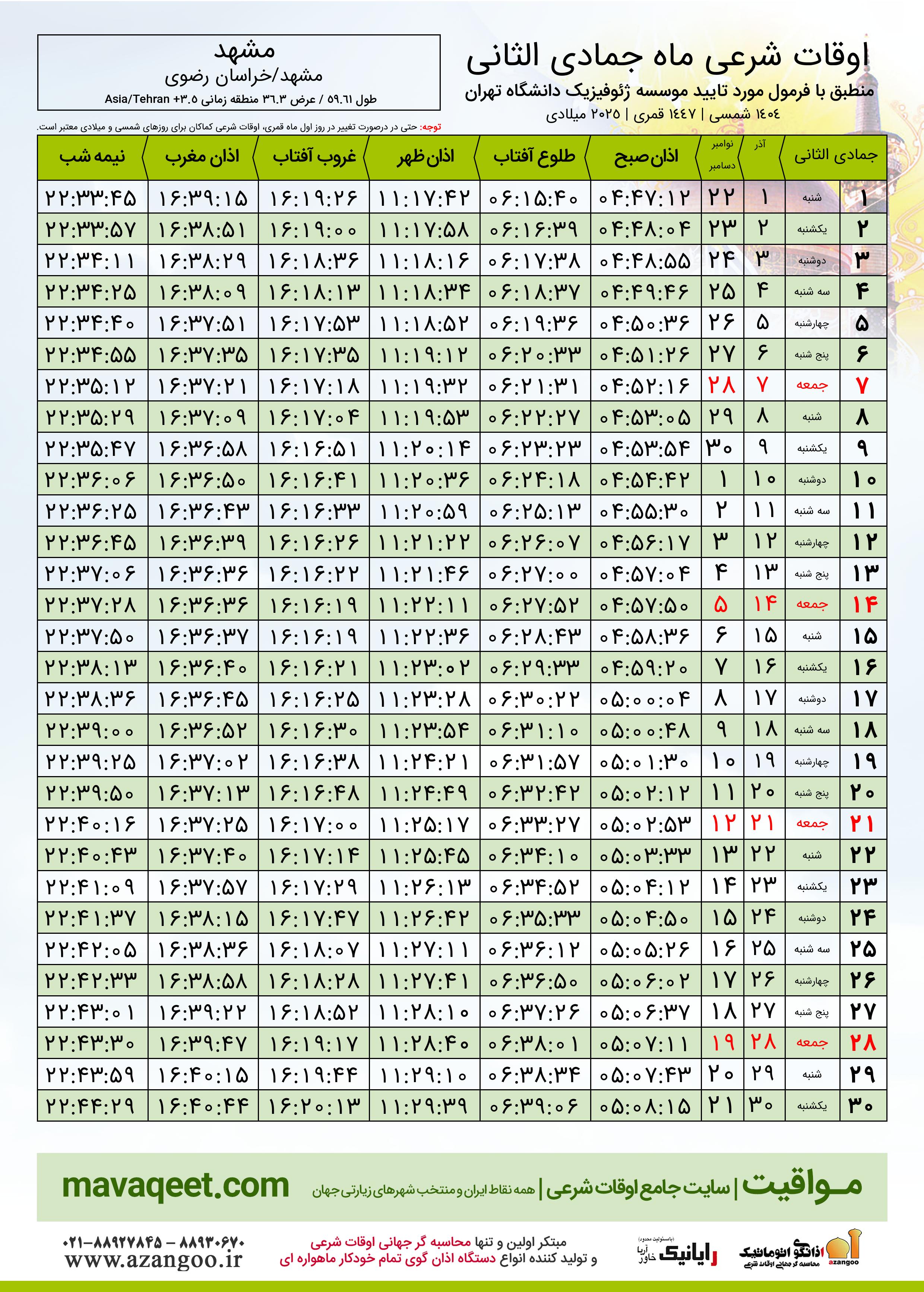 جدول اوقات شرعی جمادی الثانی ١٤٤٧ قمری شهر مشهد