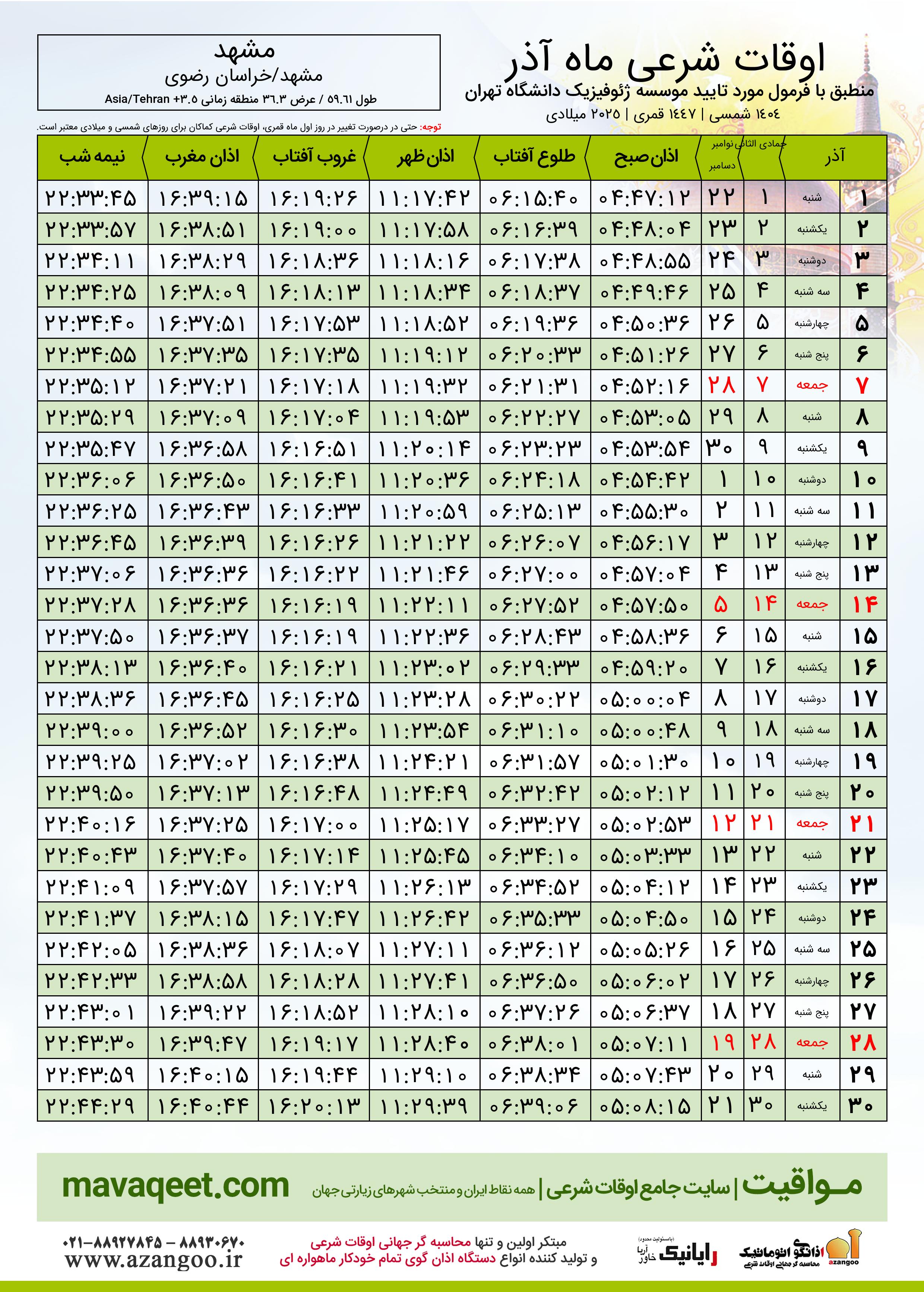 اوقات شرعی آذر ١٤٠٤ شمسی شهر مشهد