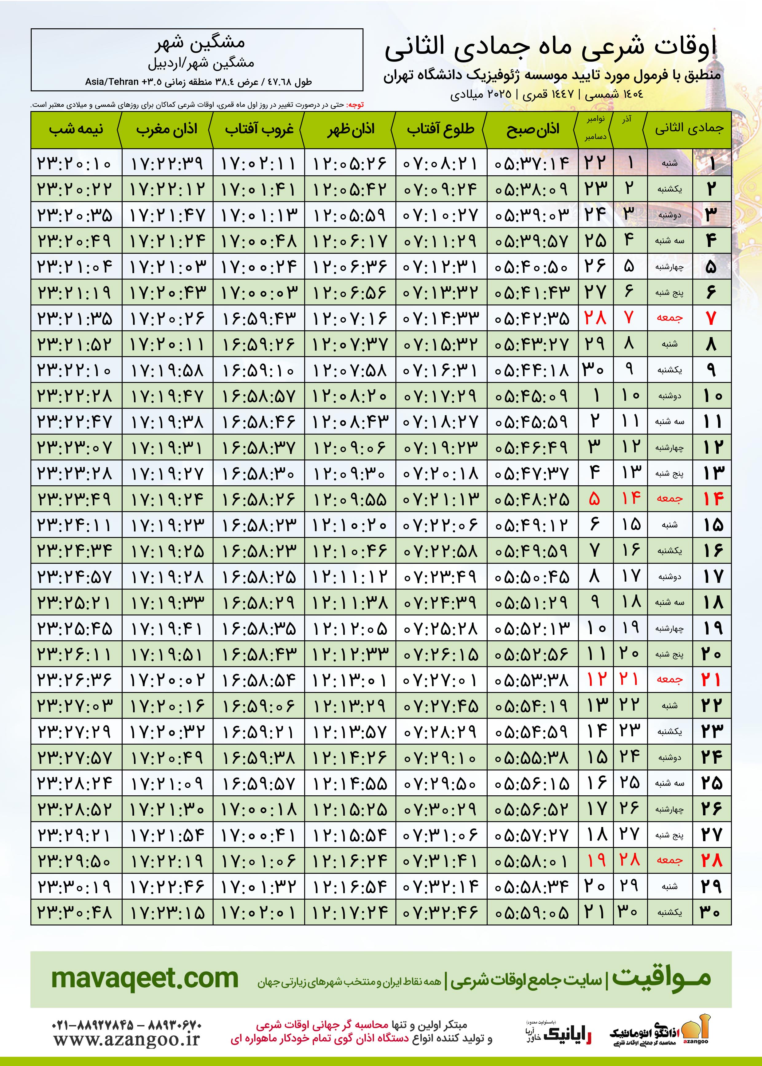 جدول اوقات شرعی جمادی الثانی ١٤٤٧ قمری شهر مشگین شهر