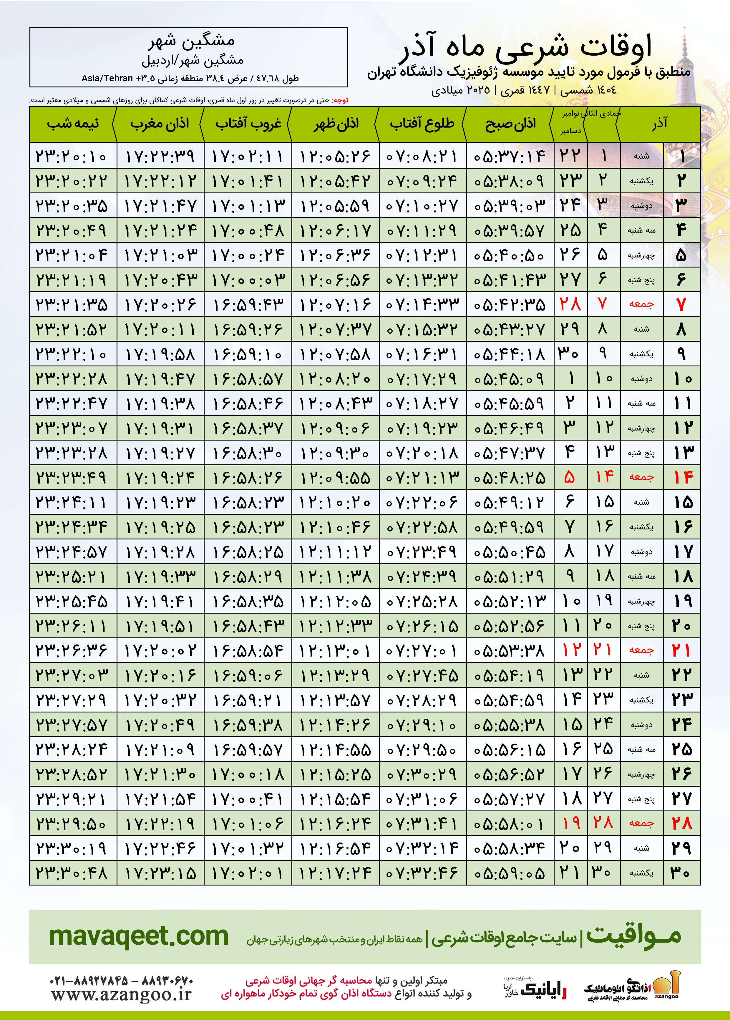 دانلود اوقات شرعی دسامبر ٢٠٢٥ شهر مشگین شهر