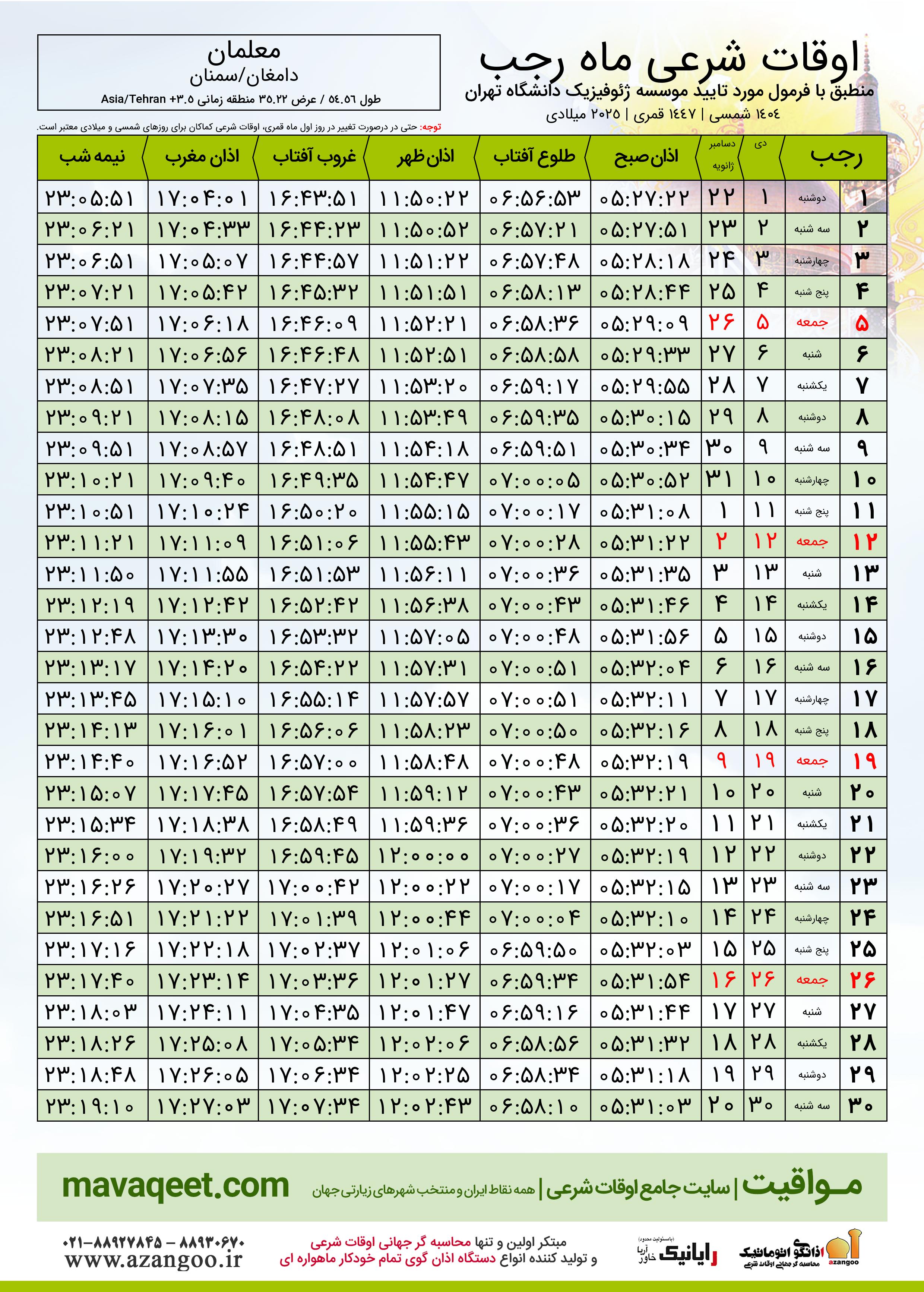 جدول اوقات شرعی رجب ١٤٤٧ قمری شهر معلمان