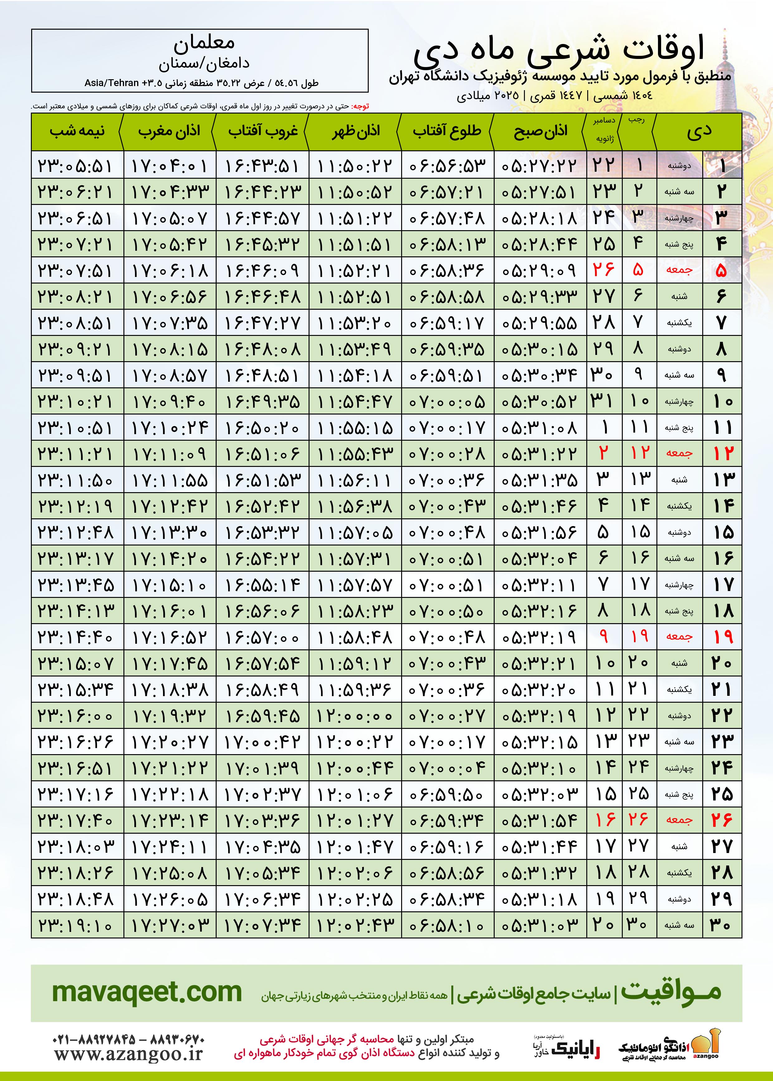 | ٢٣ دی ١٤٠٤ | ٠٥:٣٢:١٥ | ٠٧:٠٠:١٧ | ١٢:٠٠:٢٢ | ١٧:٠٠:٤٢ | ١٧:٢٠:٢٧ | ٢٣:١٦:٢٦ |