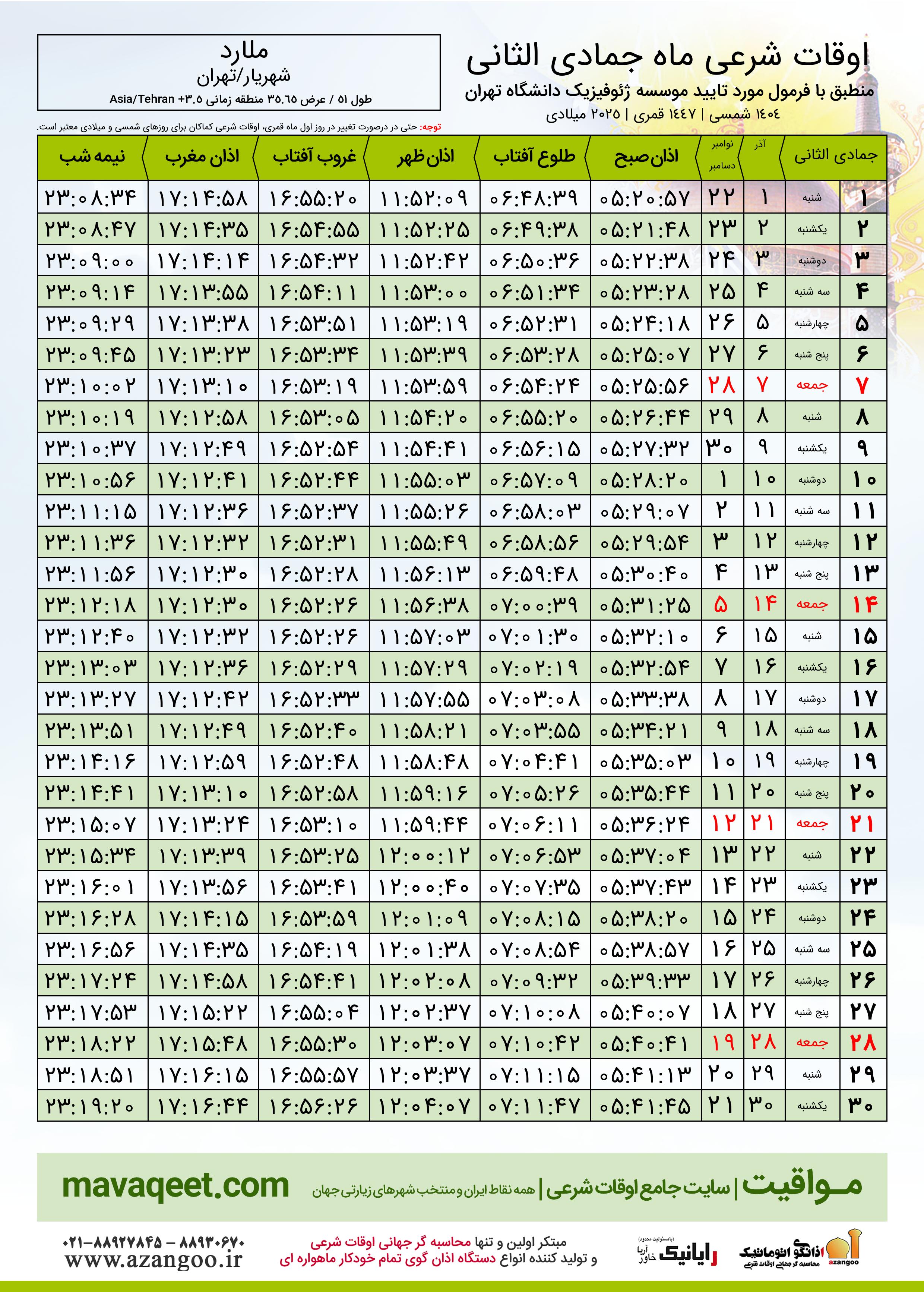 اوقات شرعی ماه جمادی الثانی ١٤٤٧ هـ.ق شهر ملارد بر