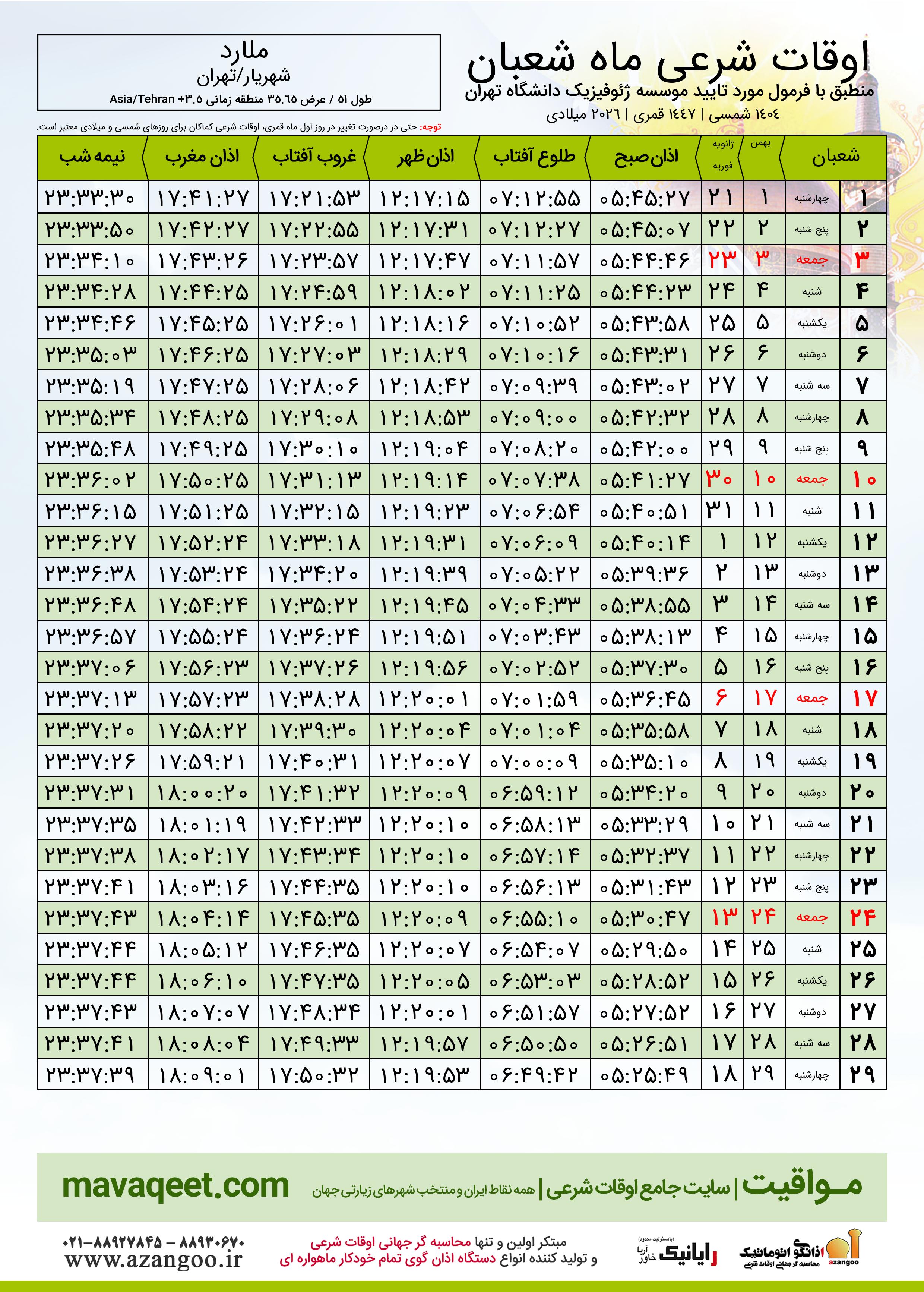 اوقات شرعی ماه شعبان ١٤٤٧ هـ.ق شهر ملارد بر