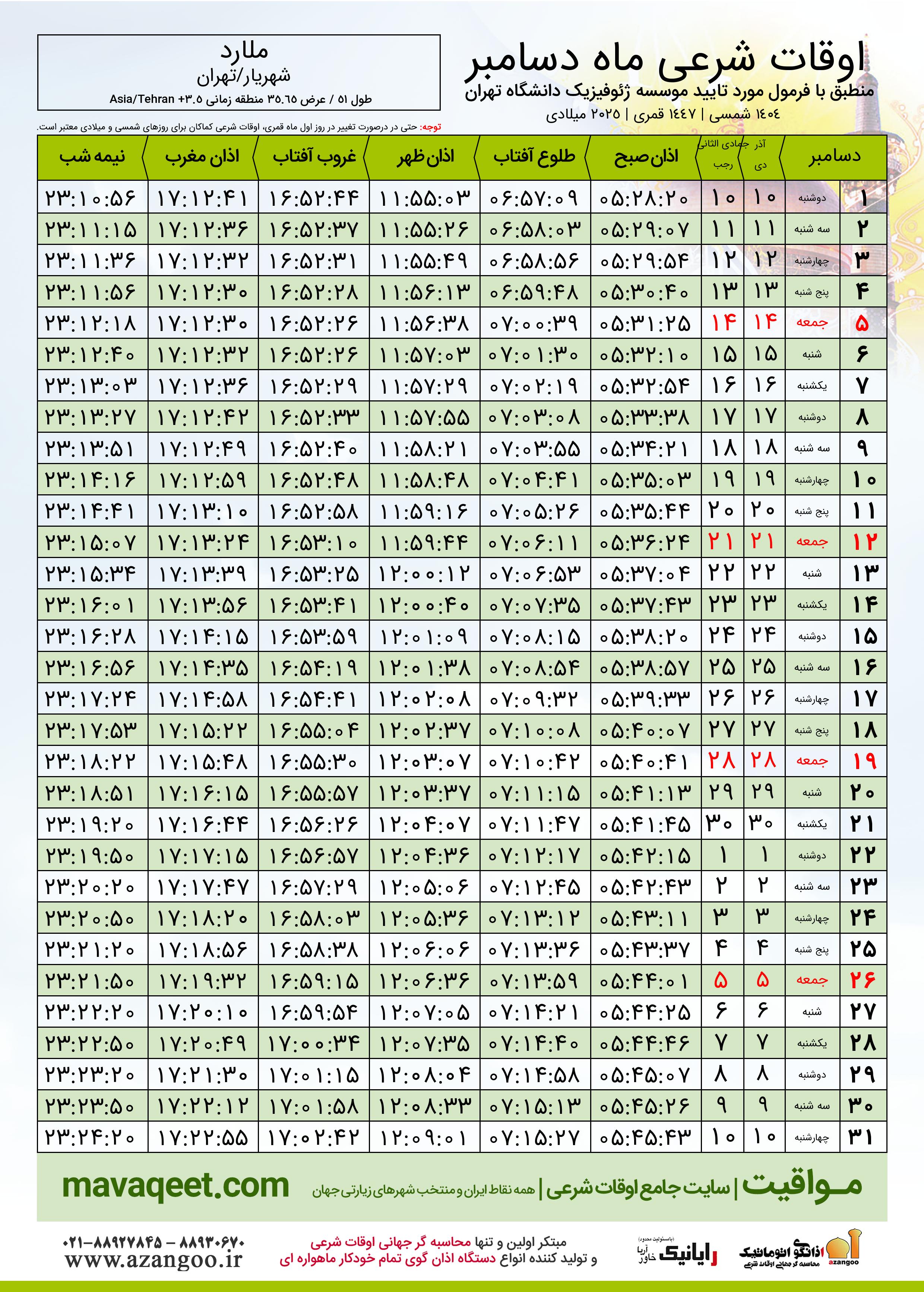 جهت نمایش تصویر جدول اوقات شرعی جدول اوقات شرعی دسامبر ٢٠٢٥ میلادی شهر ملارد شهر ملارد در اندازه