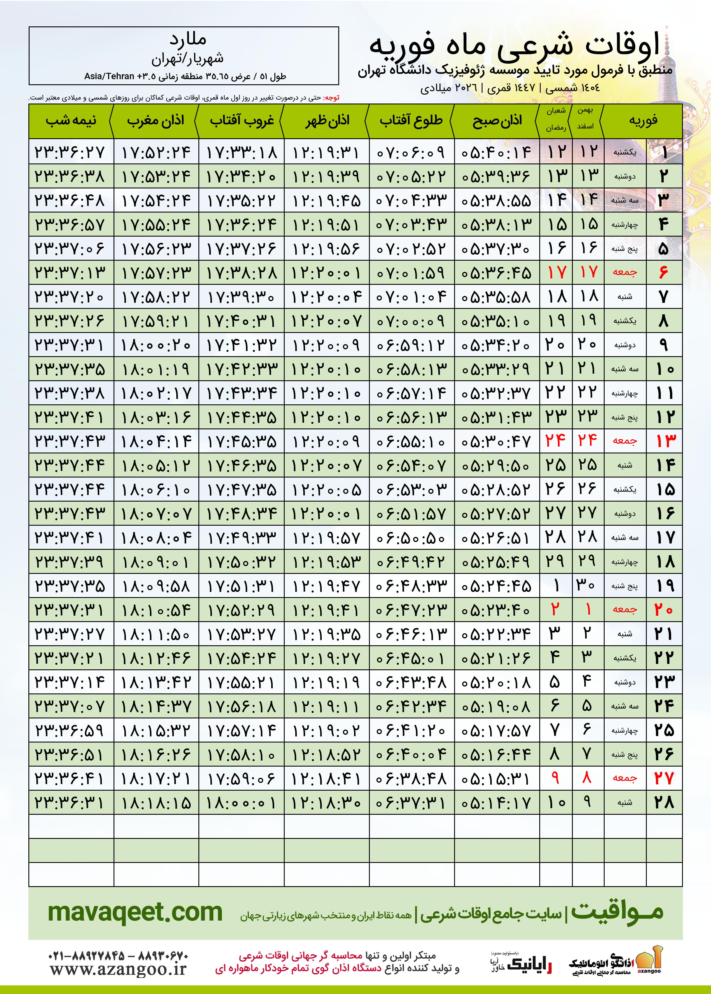 دانلود اوقات شرعی فوریه ٢٠٢٦ شهر ملارد