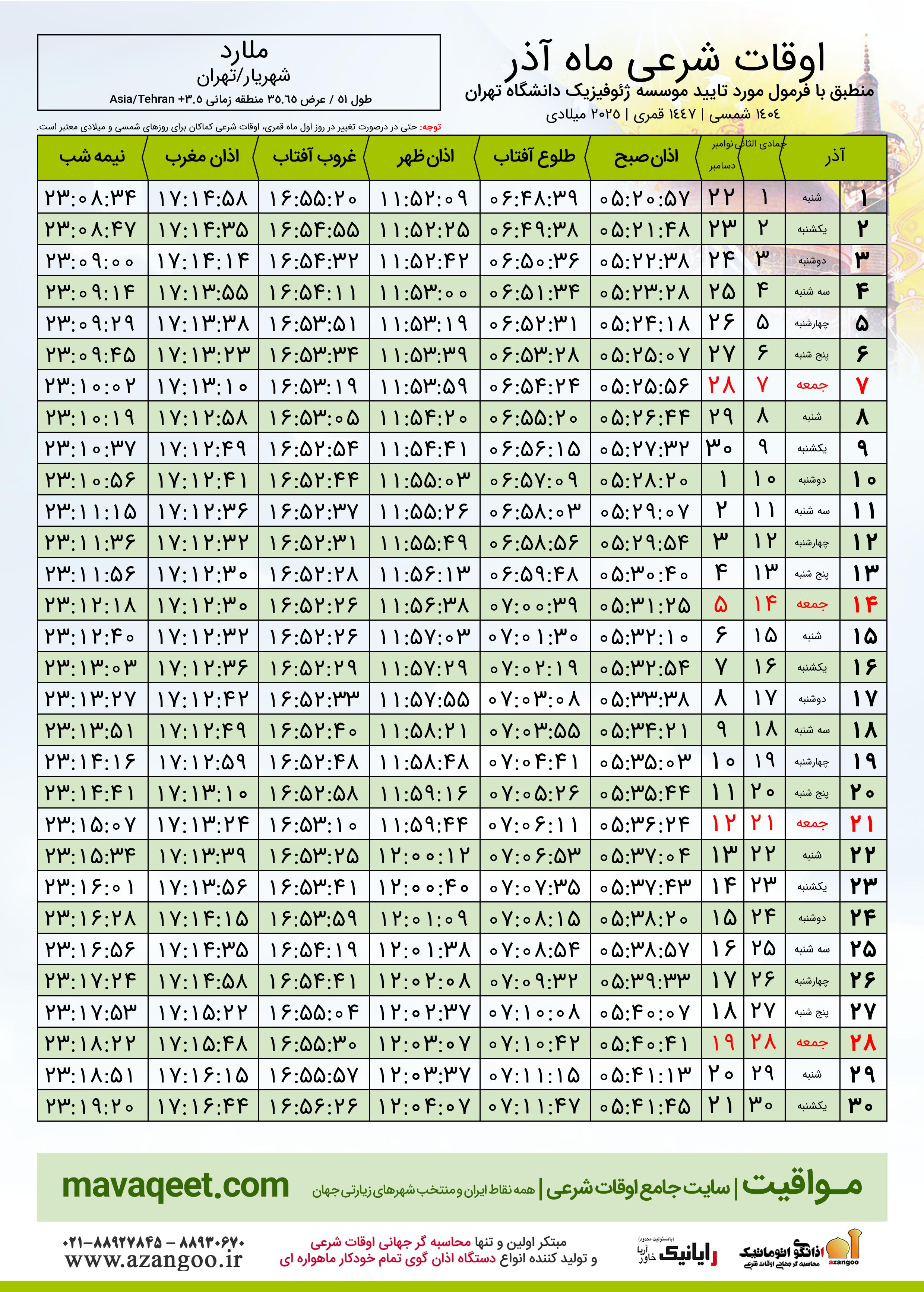 جدول اوقات شرعی آذر ١٤٠٤ شمسی شهر ملارد