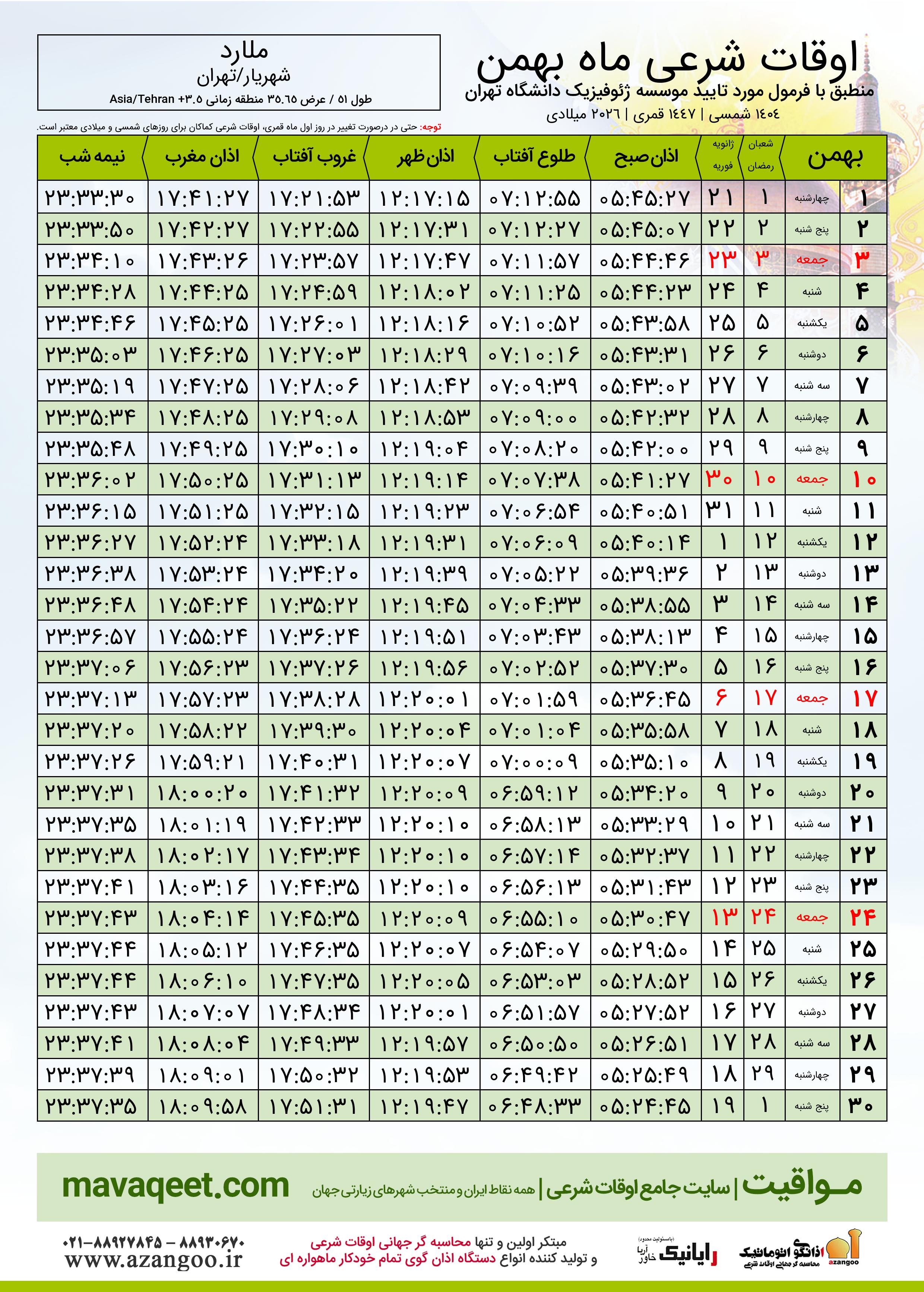 دانلود اوقات شرعی بهمن ٠٤ - ١٤٠٤ شهر ملارد