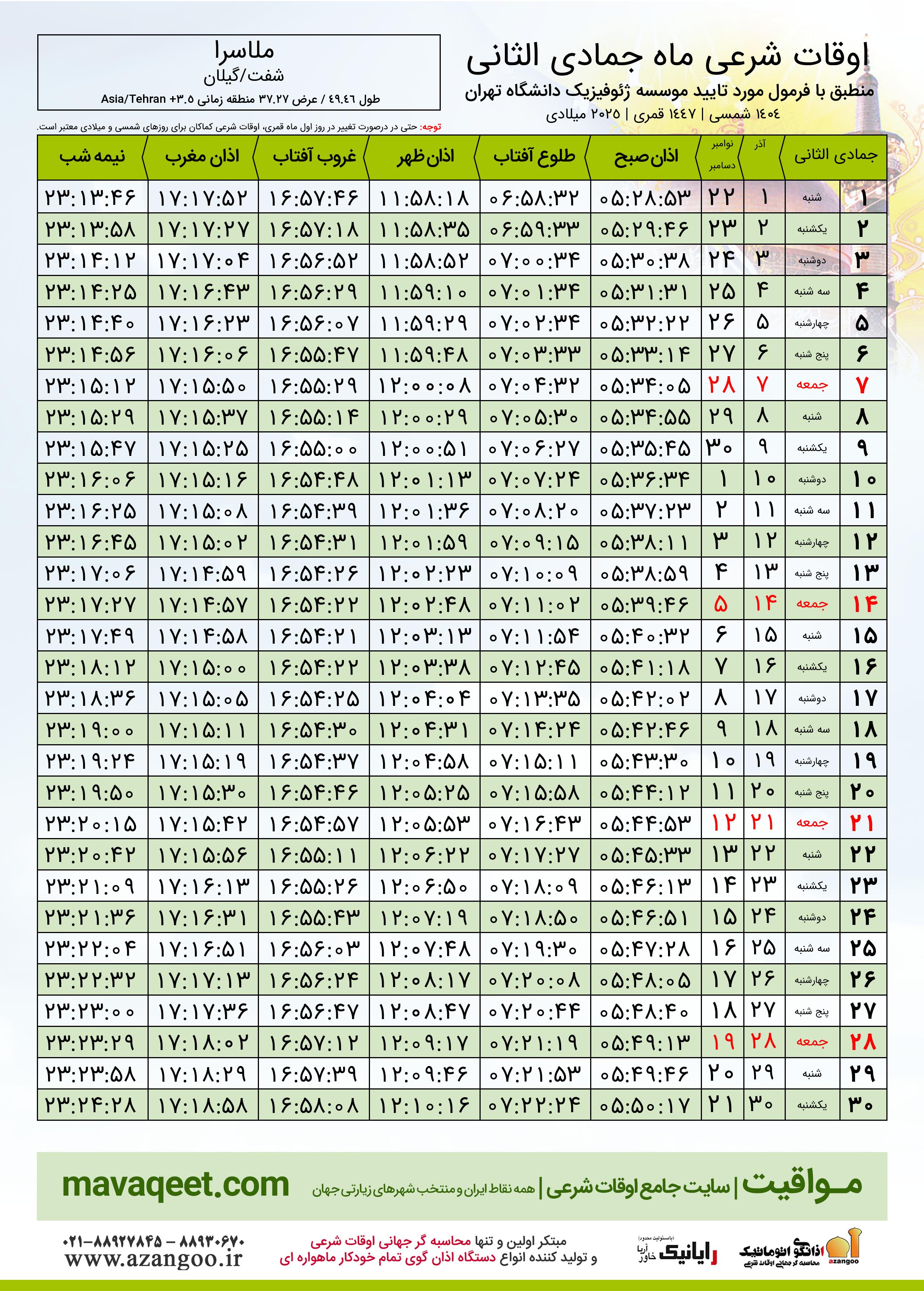 اوقات شرعی ماه جمادی الثانی ١٤٤٧ هـ.ق شهر ملاسرا بر