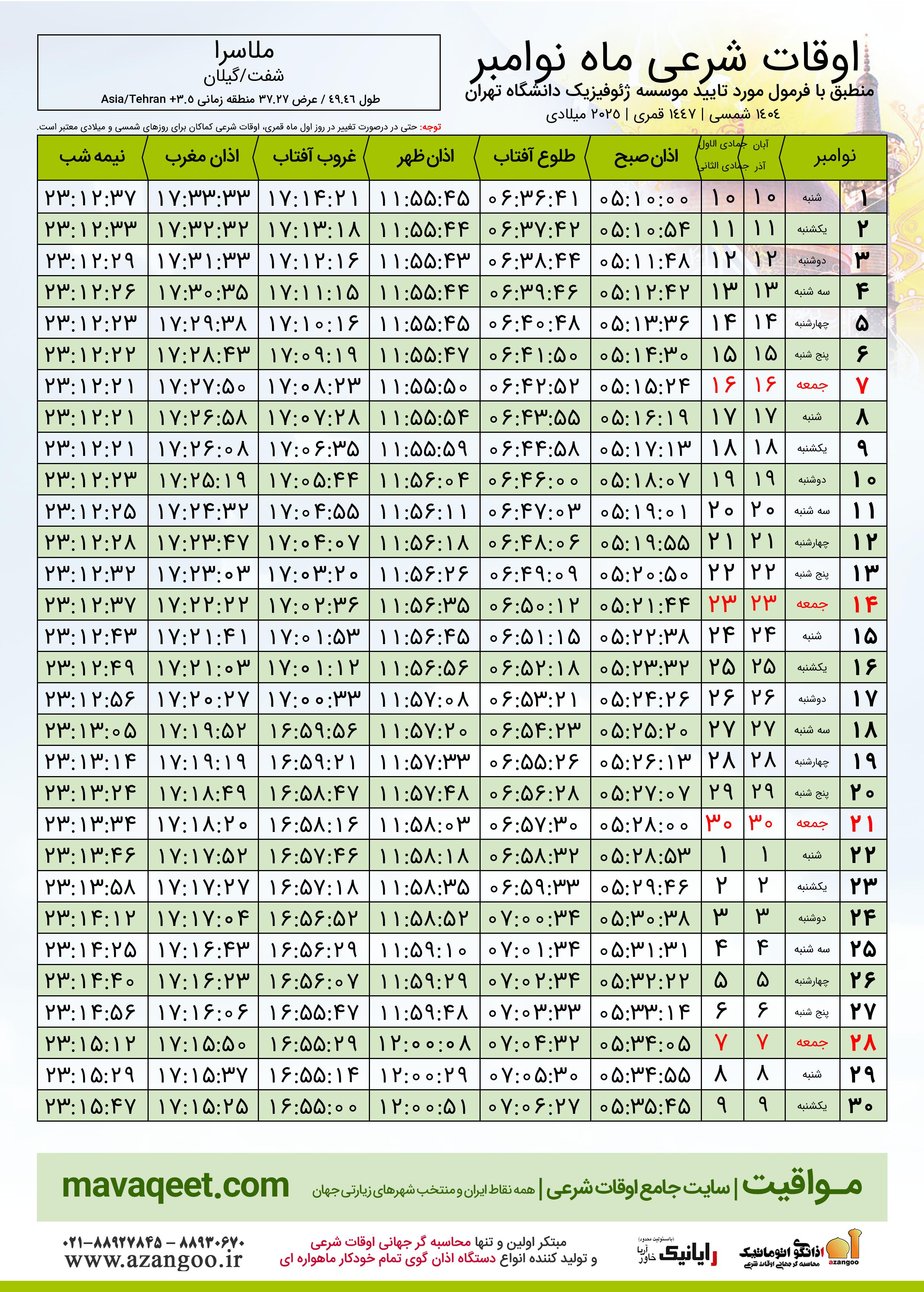جدول اوقات شرعی نوامبر ٢٠٢٥ میلادی شهر ملاسرا