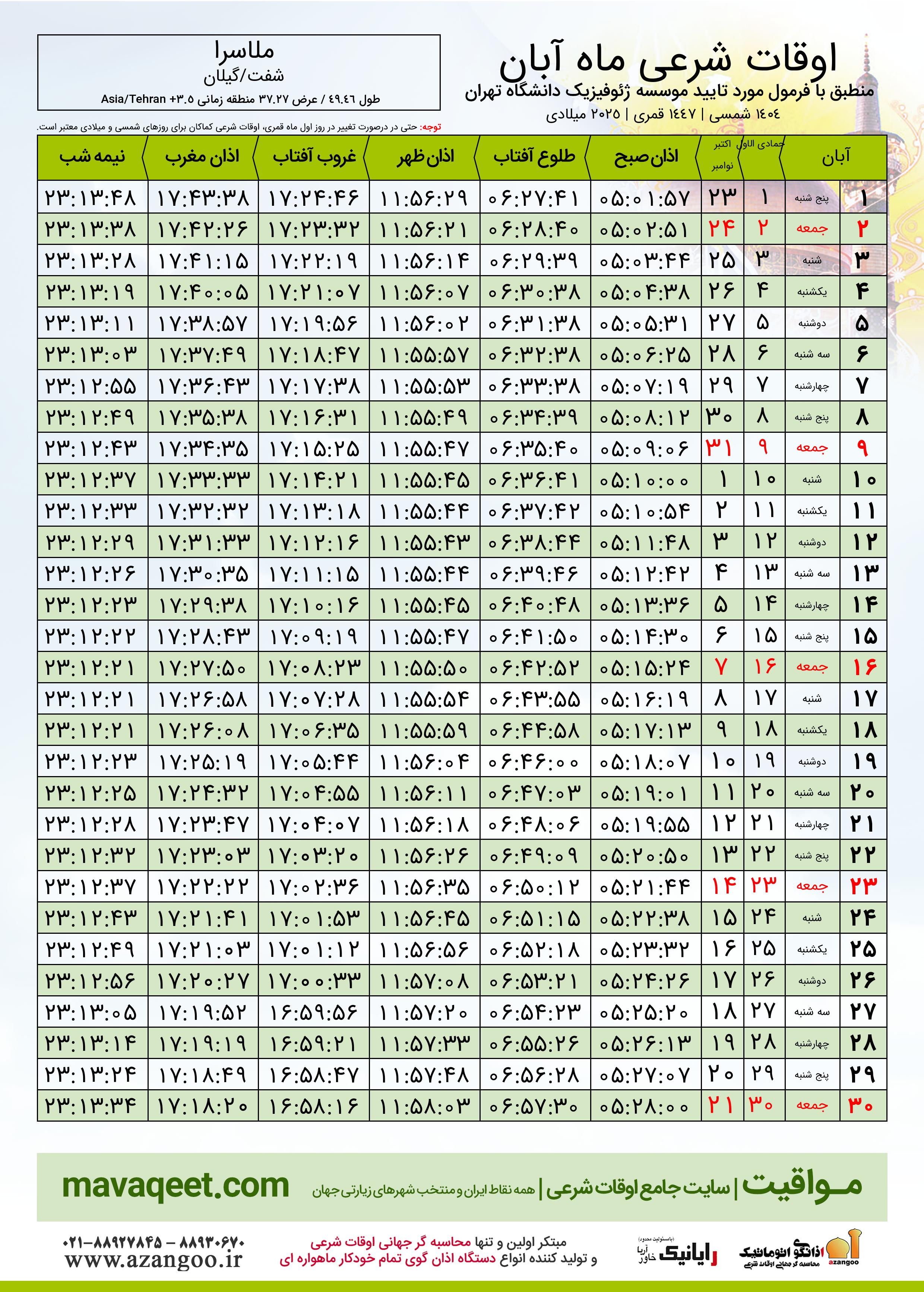 جدول اوقات شرعی آبان ١٤٠٤ شمسی شهر ملاسرا