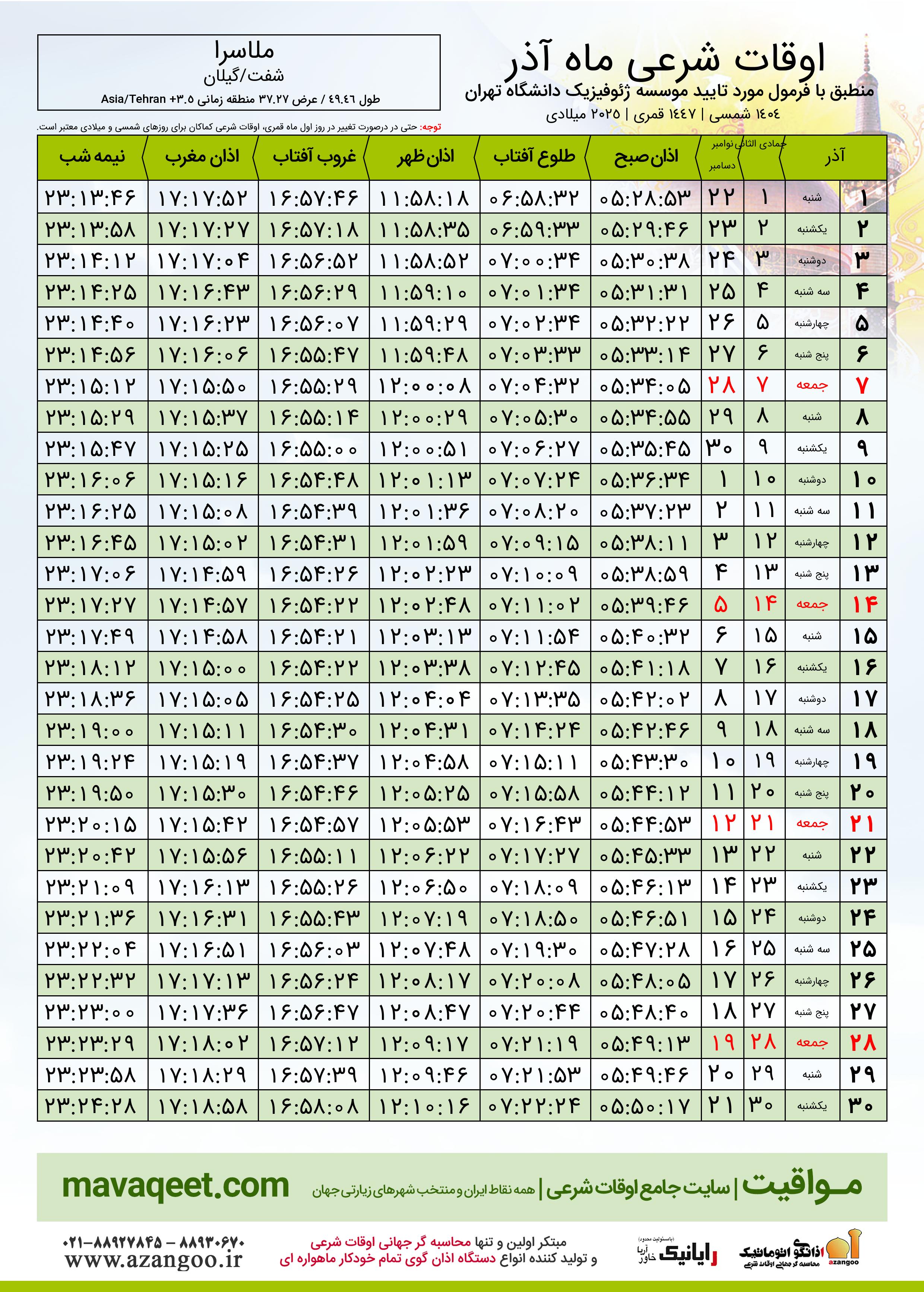جدول اوقات شرعی آذر ١٤٠٤ شمسی شهر ملاسرا