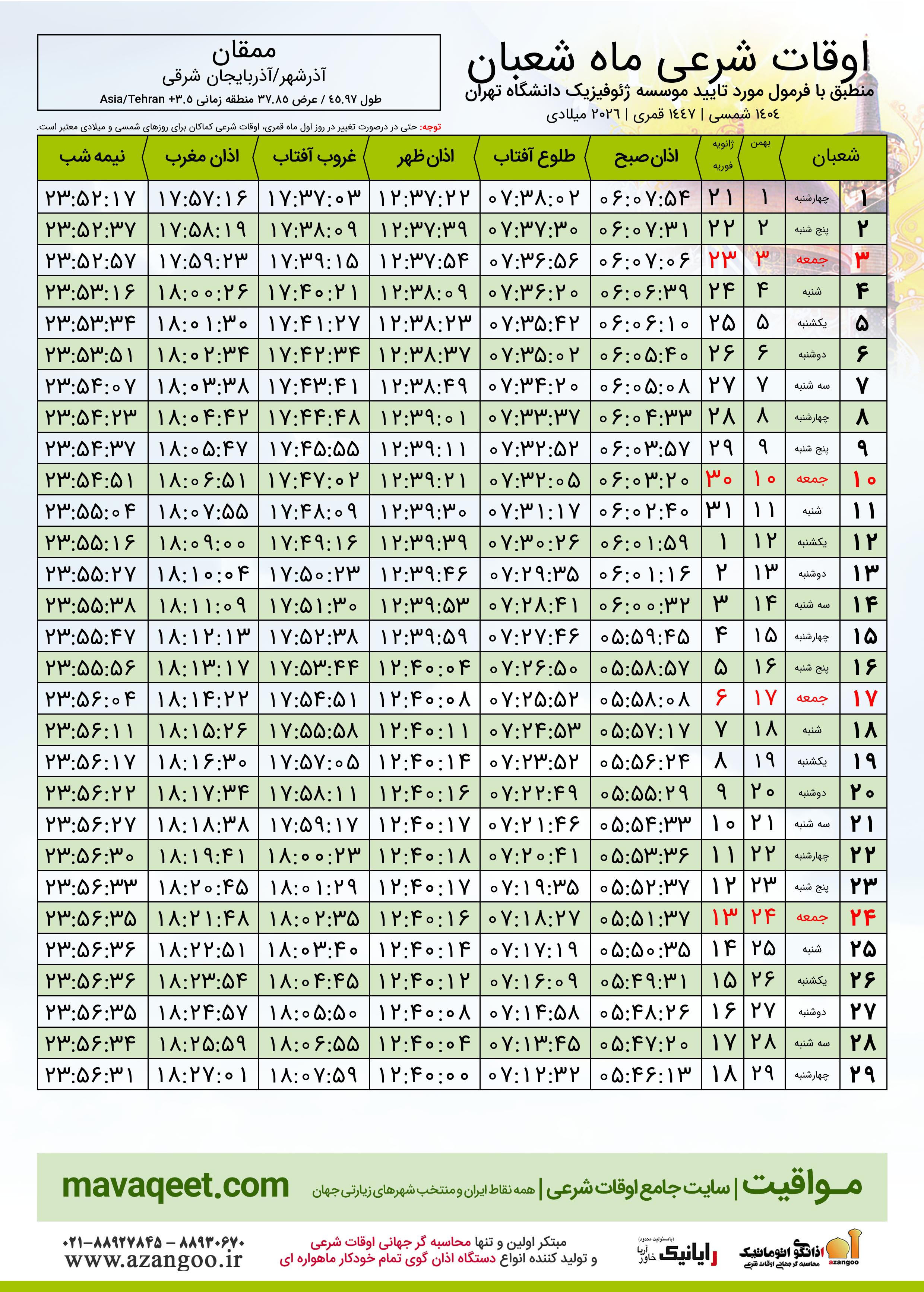 اوقات شرعی ماه شعبان ١٤٤٧ هـ.ق شهر ممقان بر
