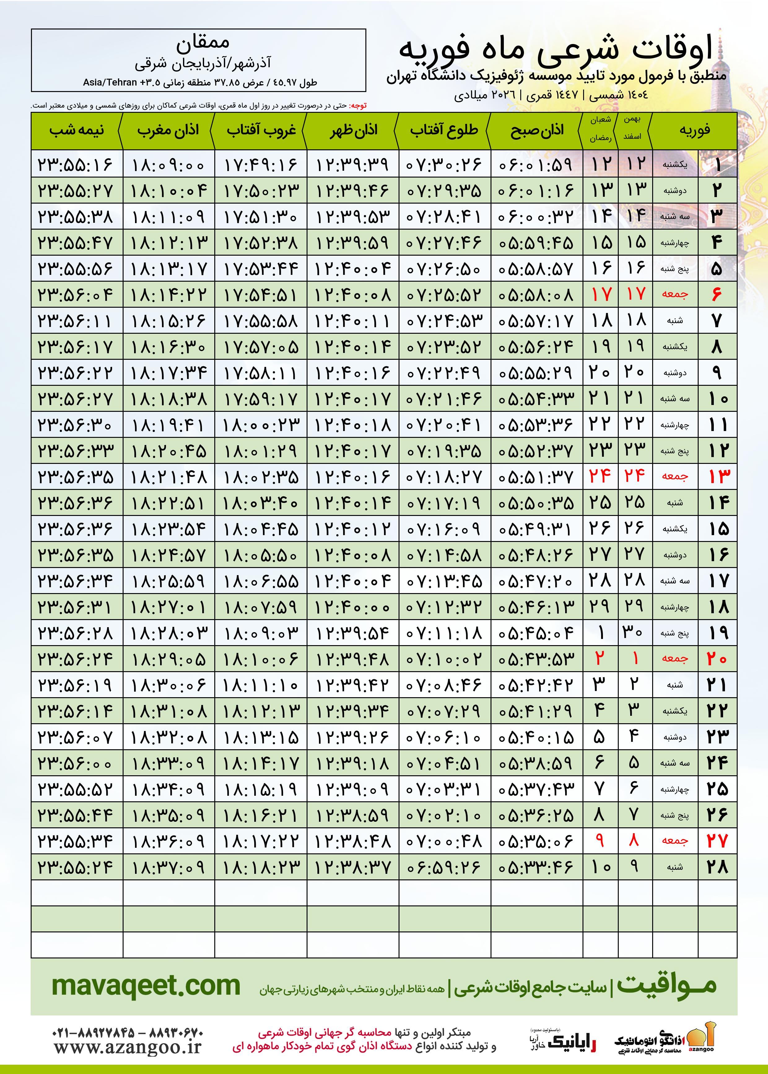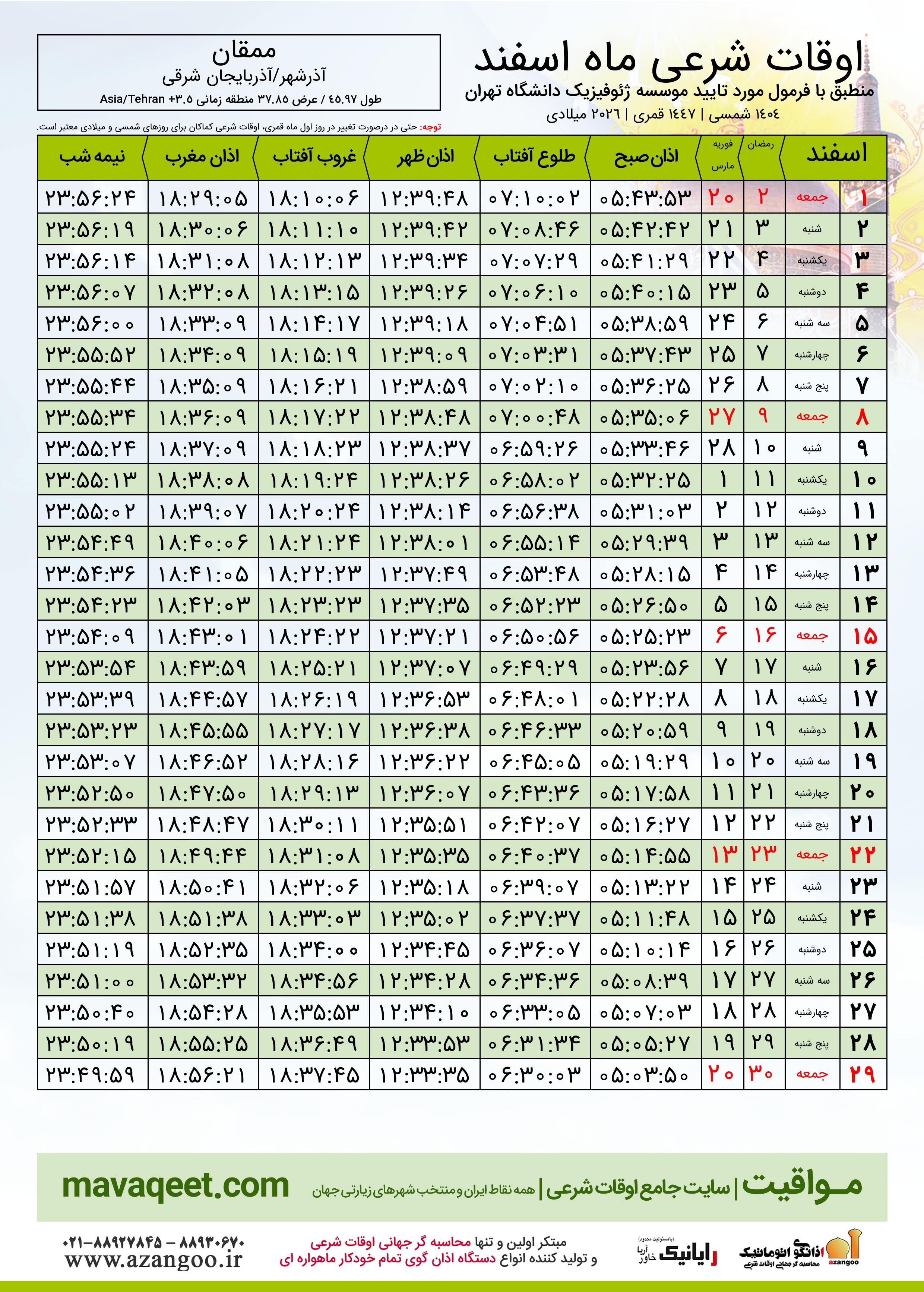 اوقات شرعی ماه رمضان شهر ممقان ١٤٠٤ - ٠٤ شمسی | ٢٠٢٦ میلادی