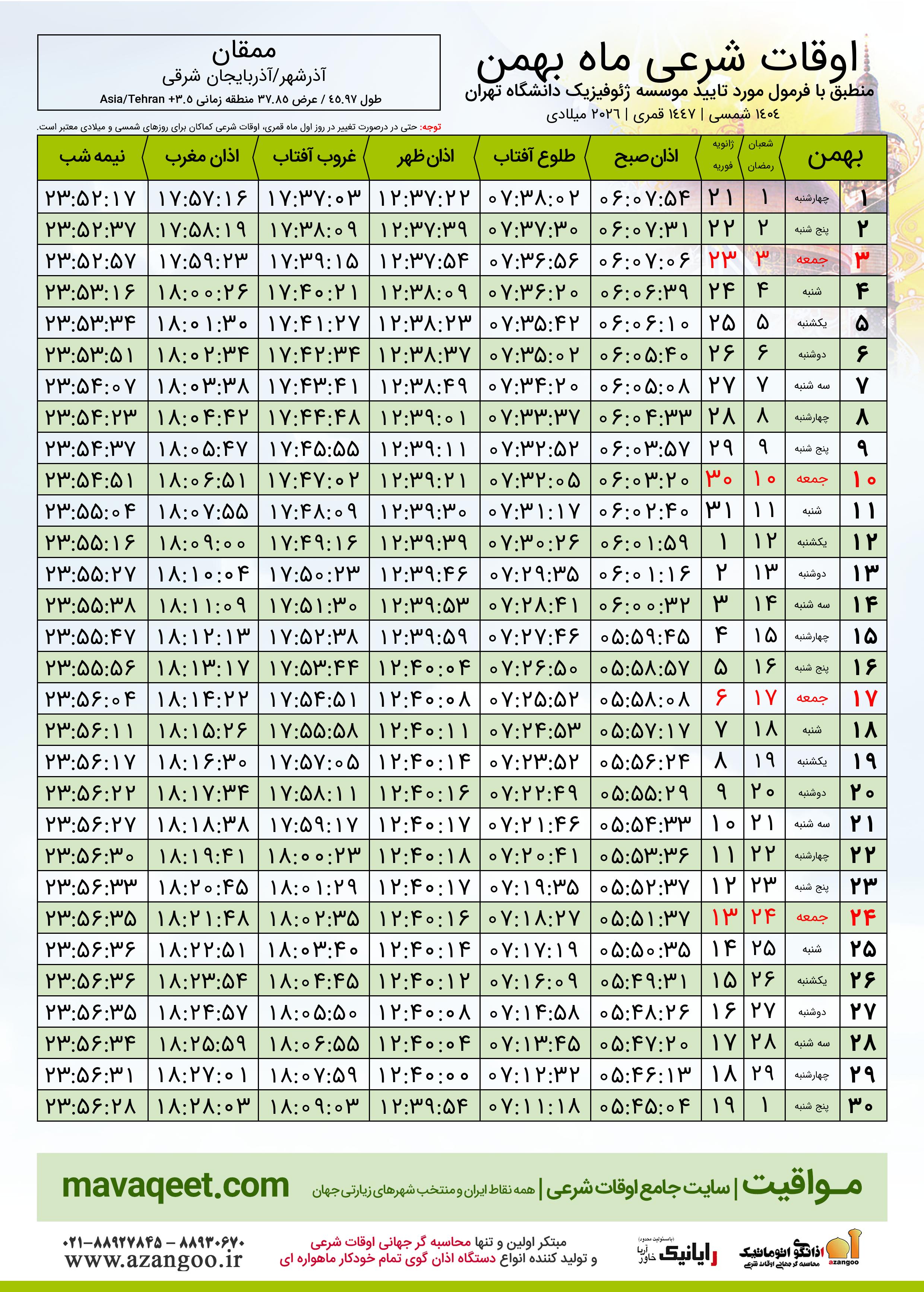 دانلود اوقات شرعی بهمن ٠٤ - ١٤٠٤ شهر ممقان