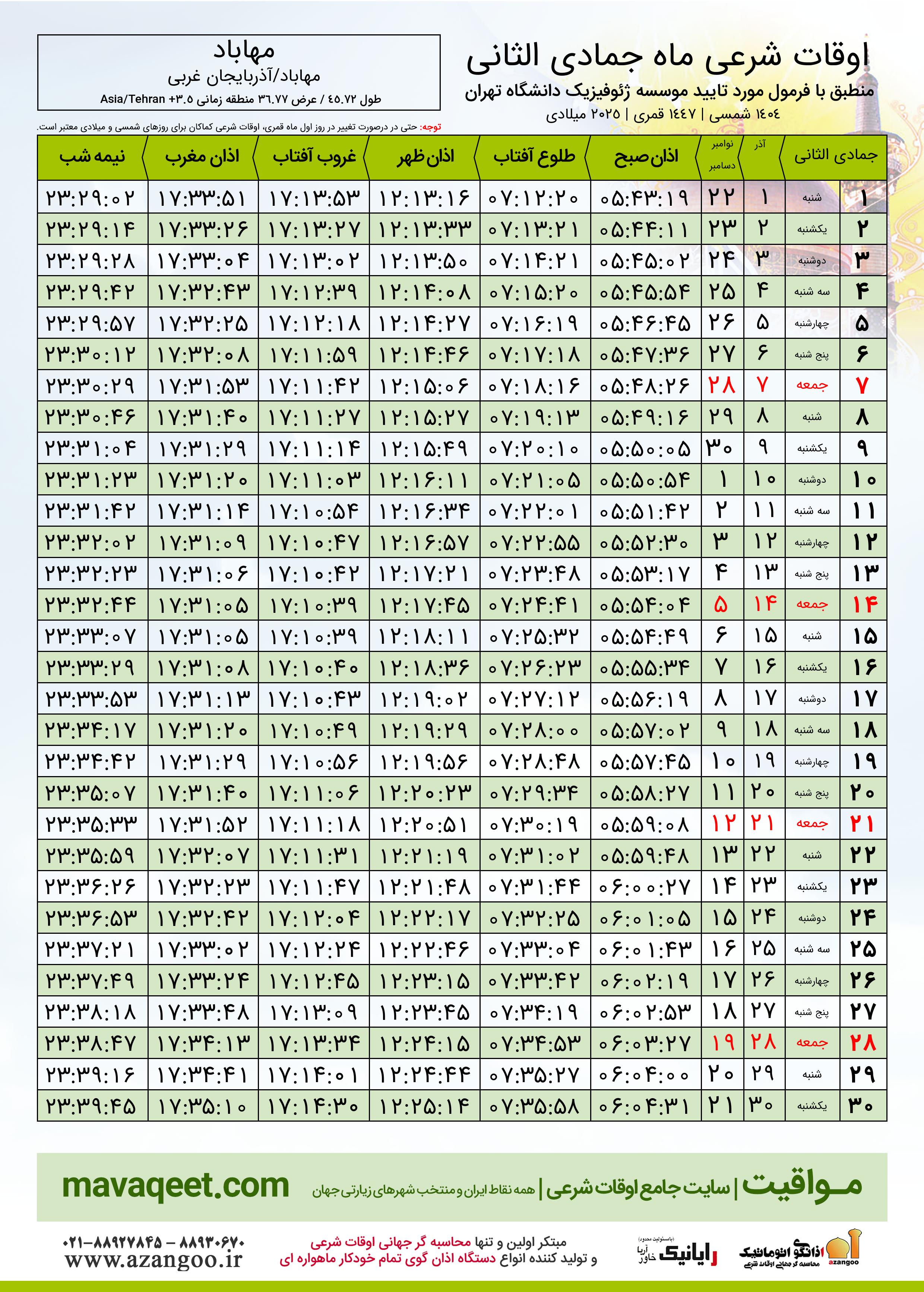 اوقات شرعی ماه جمادی الثانی ١٤٤٧ هـ.ق شهر مهاباد بر