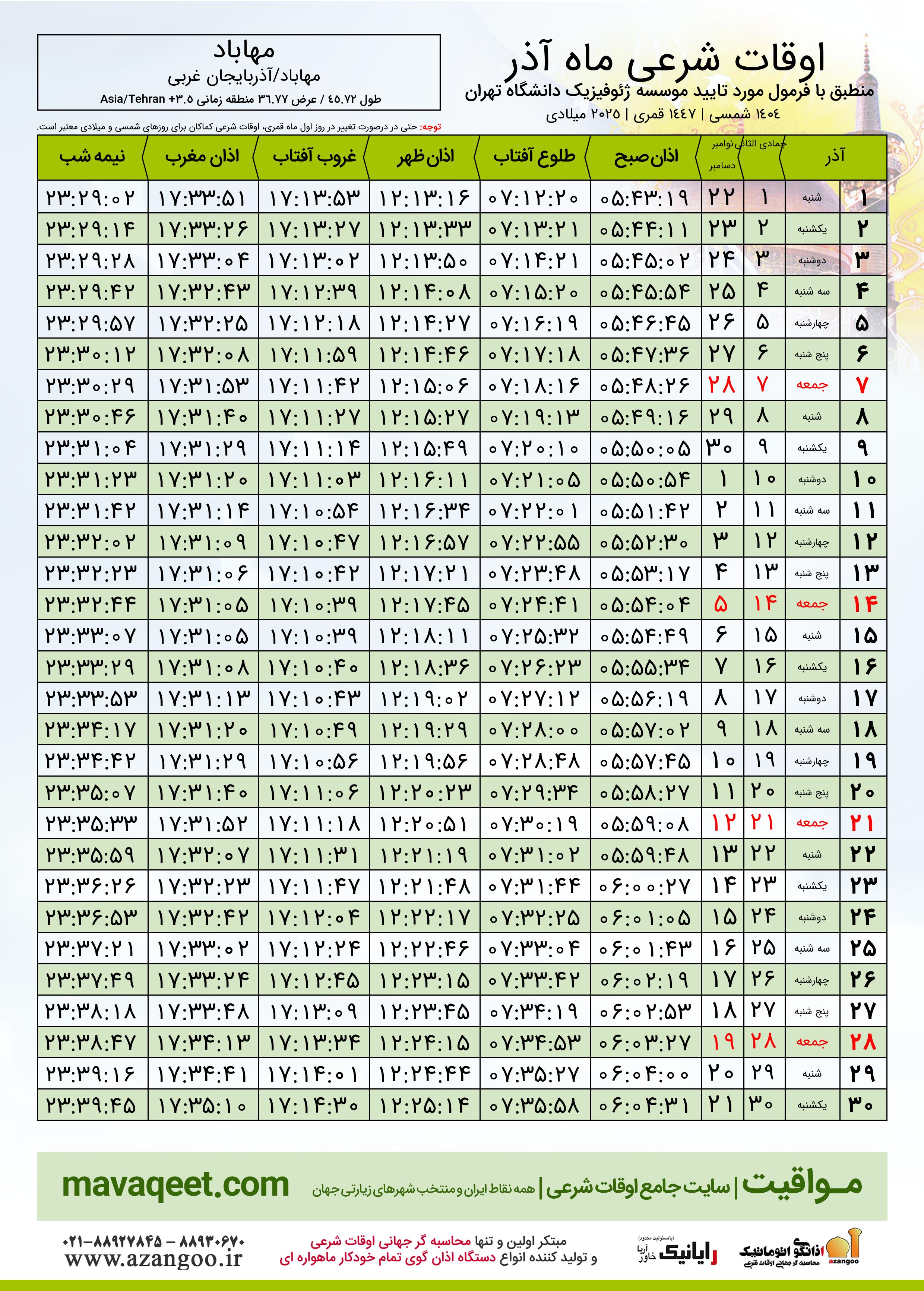 اوقات شرعی آذر ١٤٠٤ شمسی شهر مهاباد