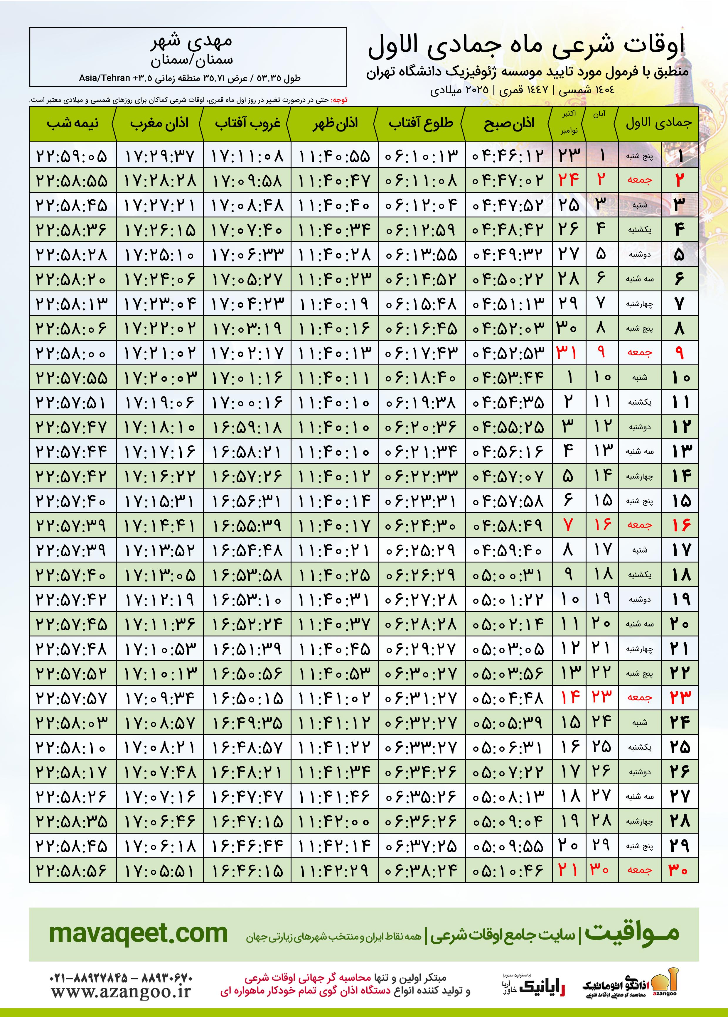 جهت نمایش تصویر جدول اوقات شرعی ماه جمادی الاول ١٤٤٧ هـ.ق شهر مهدی شهر در اندازه