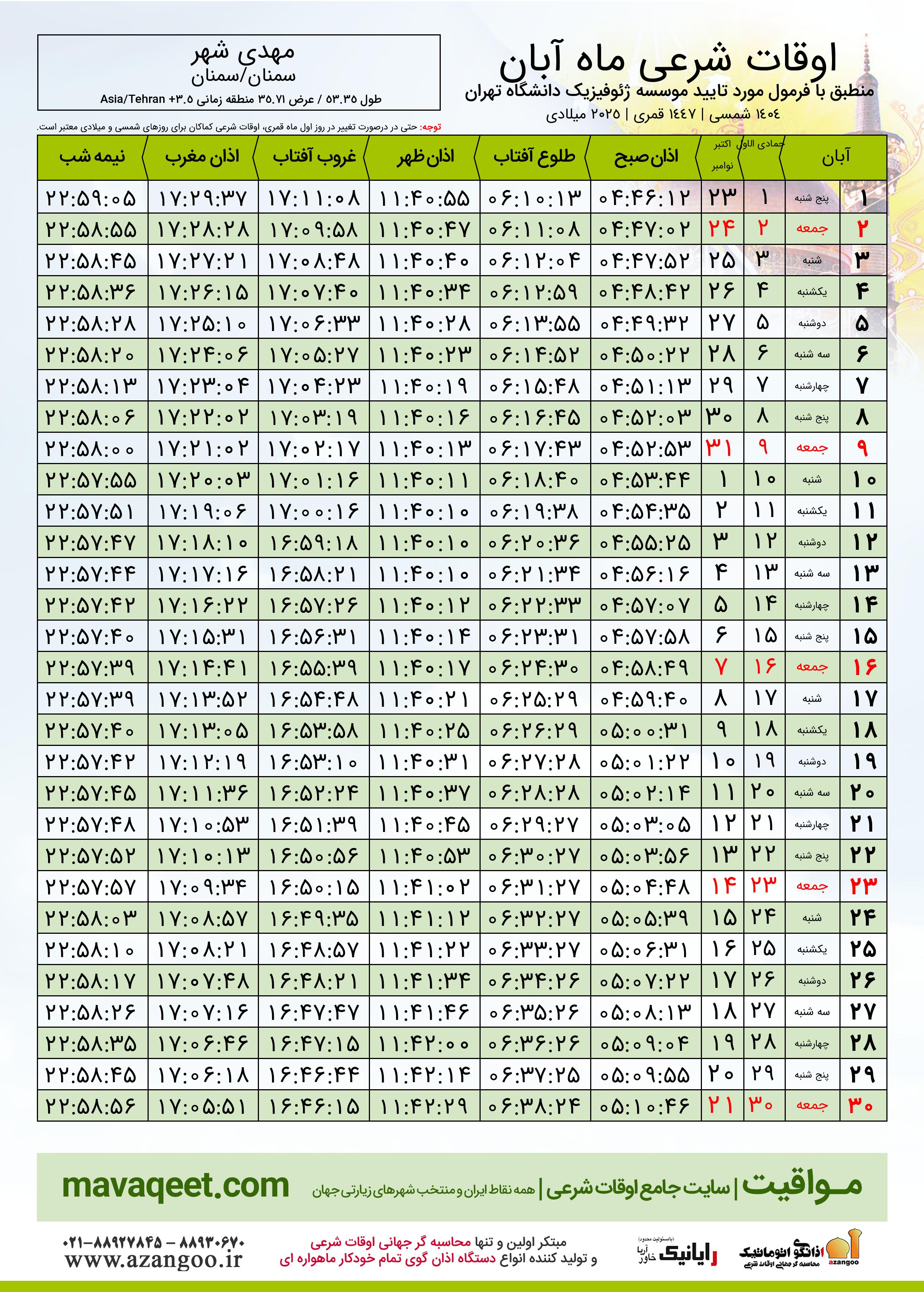 جدول اوقات شرعی آبان ١٤٠٤ شمسی شهر مهدی شهر