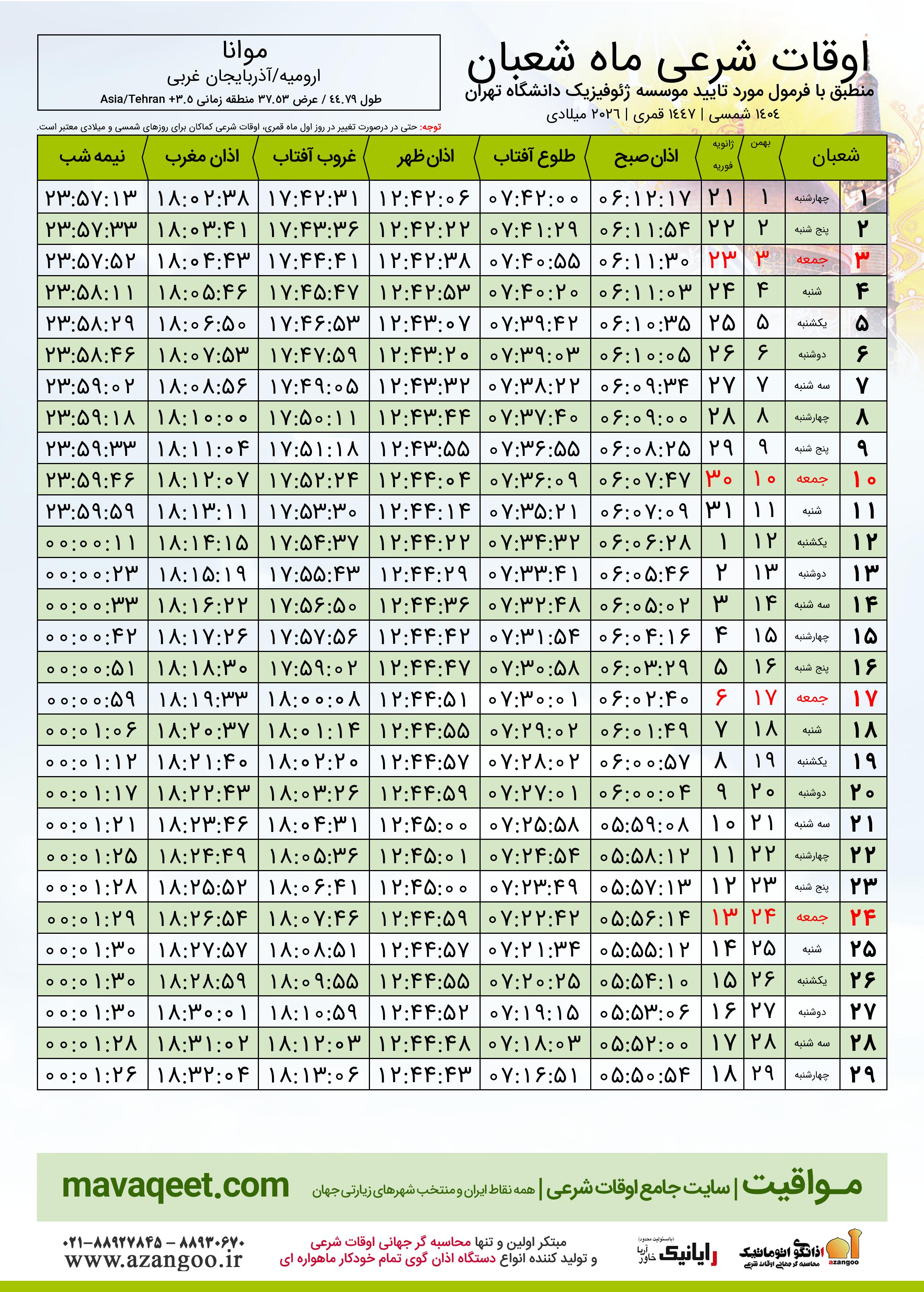 اوقات شرعی ماه شعبان ١٤٤٧ هـ.ق شهر موانا بر