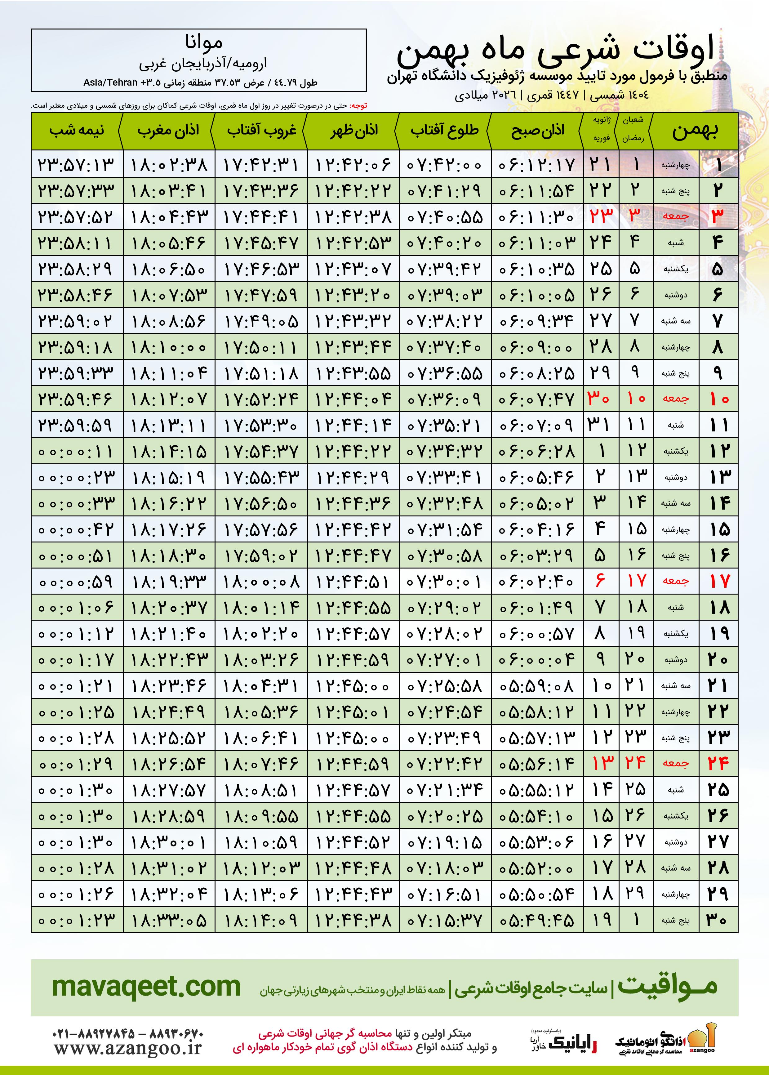 دانلود اوقات شرعی بهمن ٠٤ - ١٤٠٤ شهر موانا